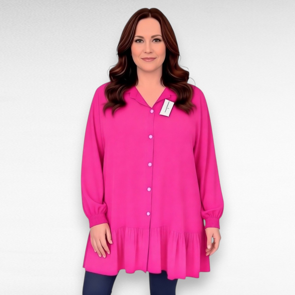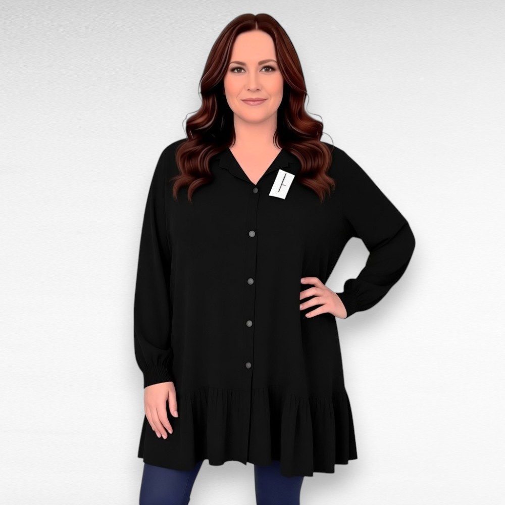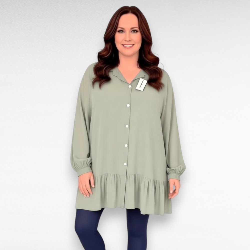Naiselik eest nööpidega alt laia satsiga V-kaelusega lohvaka tegumoega pikkade avarate otsast nööbiga kinnituvate mansetiga varrukatega tuunika Itaaliast. Materjal on vaevumärgatava sädelusega-sobib kanda nii igapäevaselt kui ka pidulikul puhul.