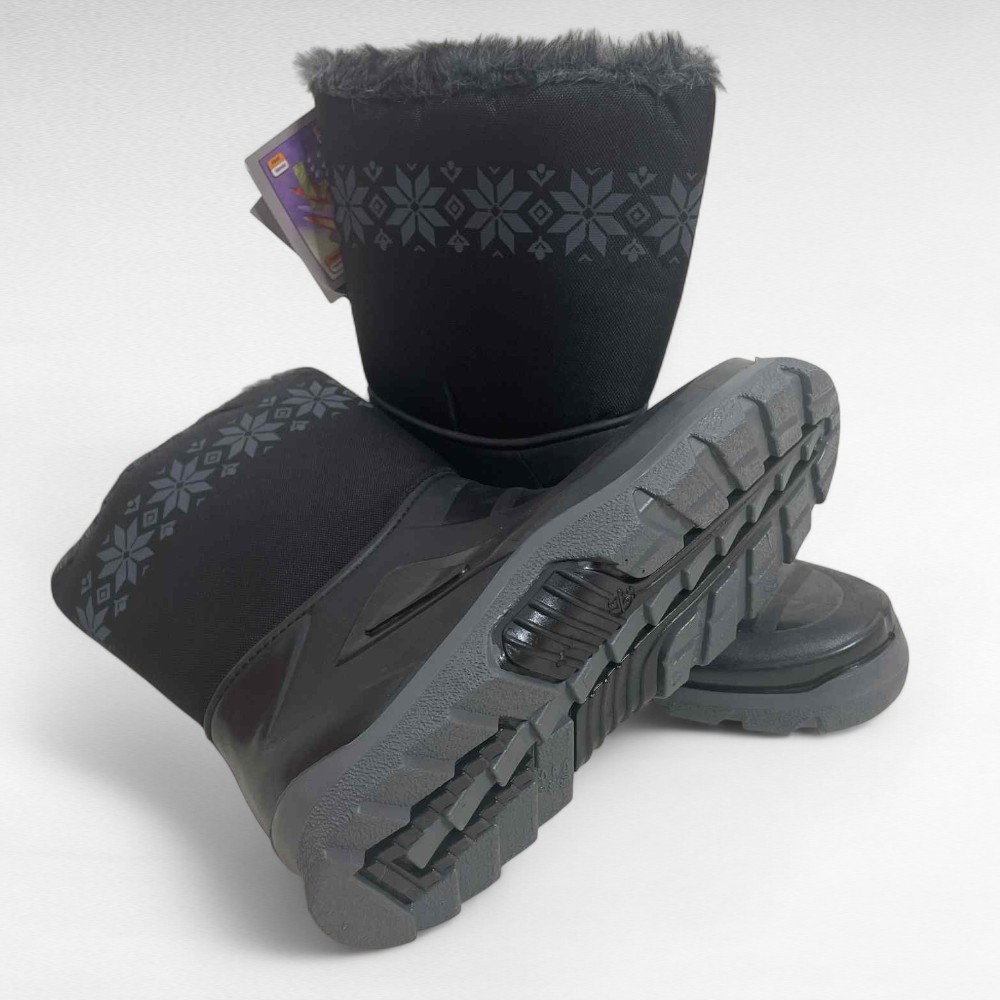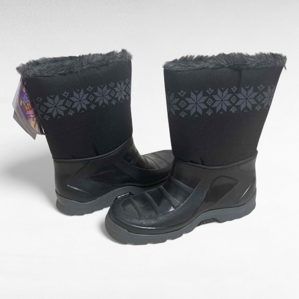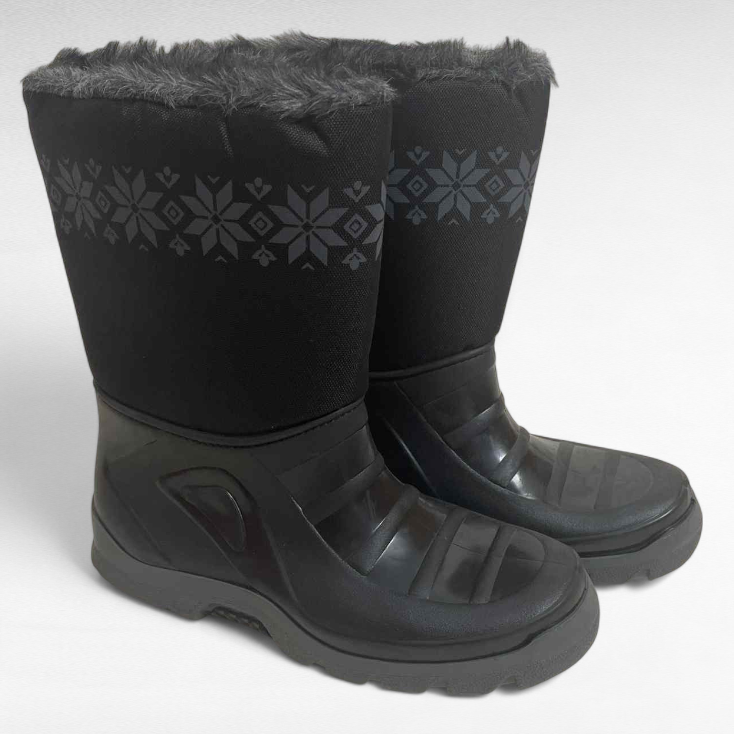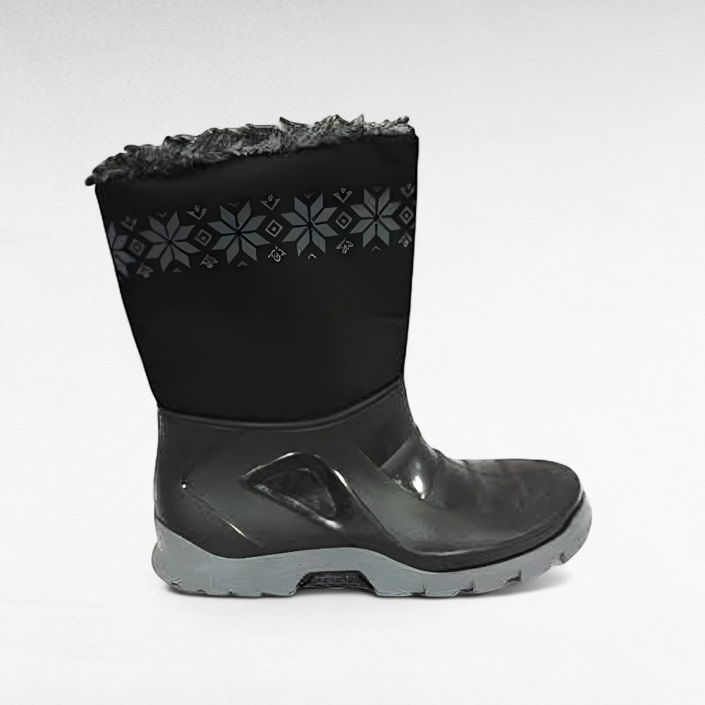 Mustad seest üleni sooja karvase voodriga naiste kummikud “Vin-Tex”. Ülemine osa on niiskuskindlast kangast, üleval rahvuslik hallikirju muster, alumine osa on kummist. Krobeline kummitald, ei libise. Vastavad suurusele ja soe sokk mahub veel ka sisse. Sobivad keskmisele liistule.