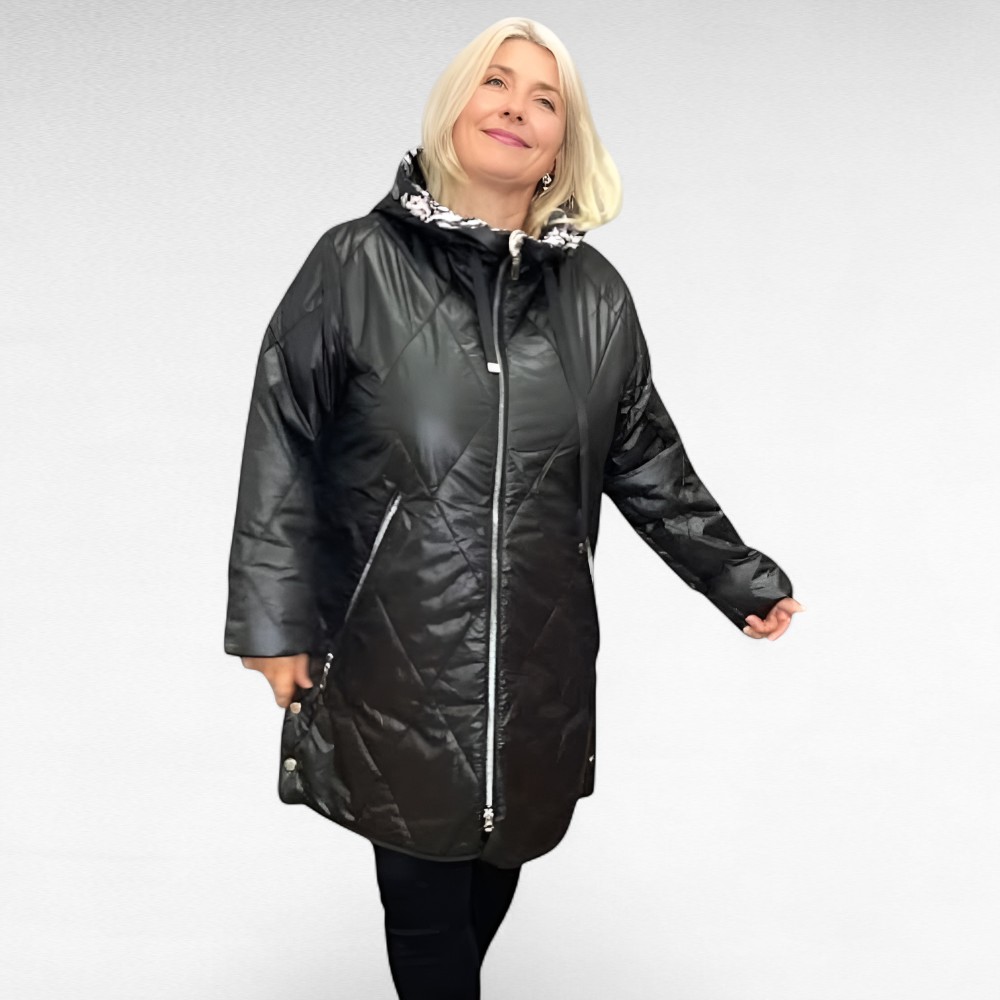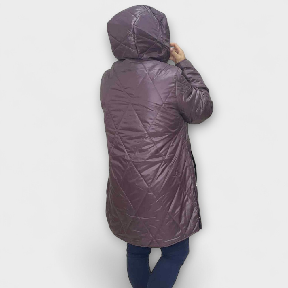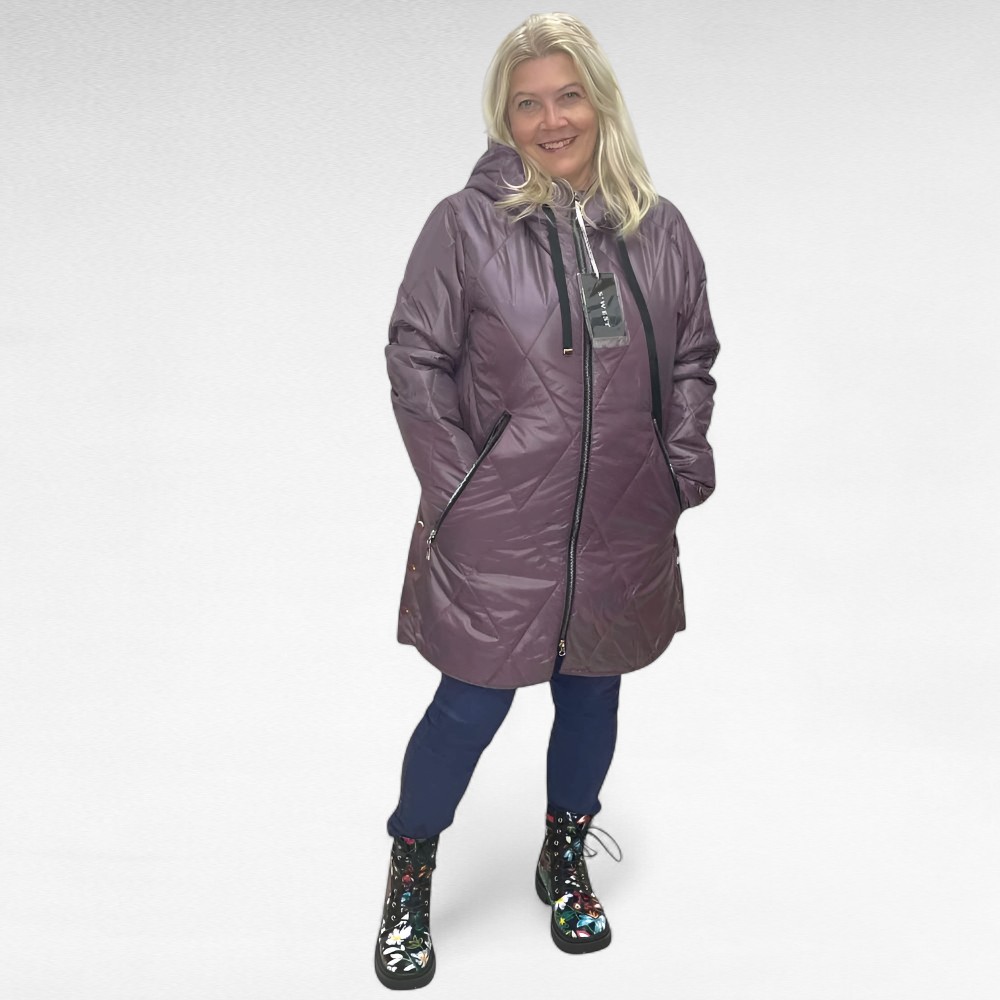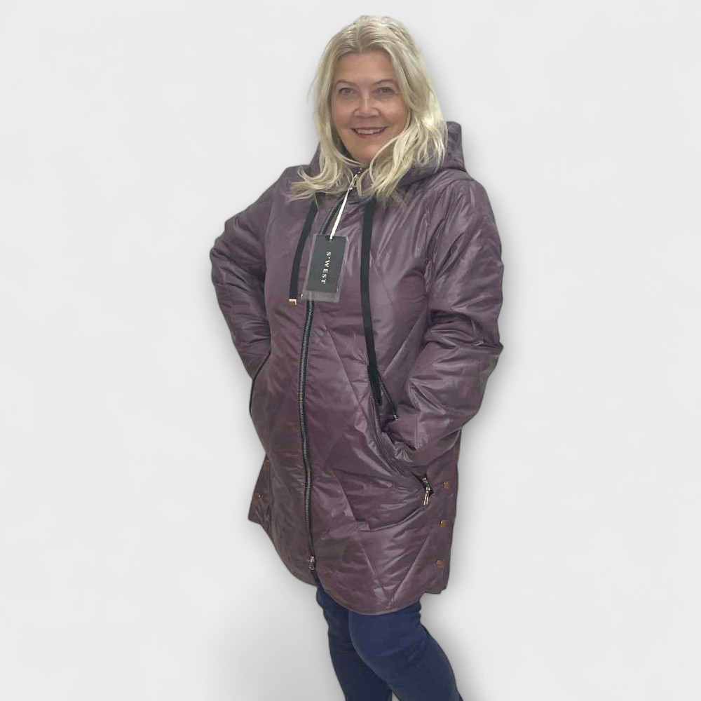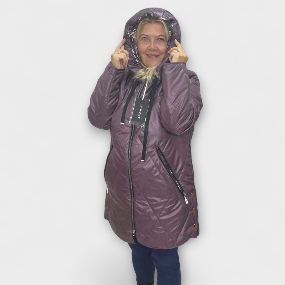 Mõnus pehme tepitud materjalist värvilise lillelise voodriga kapuutsiga ning seest kerge voodriga k/s jope “S.West”. Tegumood on alt veidi laienev, külgedel trukid. Eest kinnitub lukuga, külgedel taskud. Mõnus pehme materjal, ei krabise. Lukk käib lahti kahtepidi.