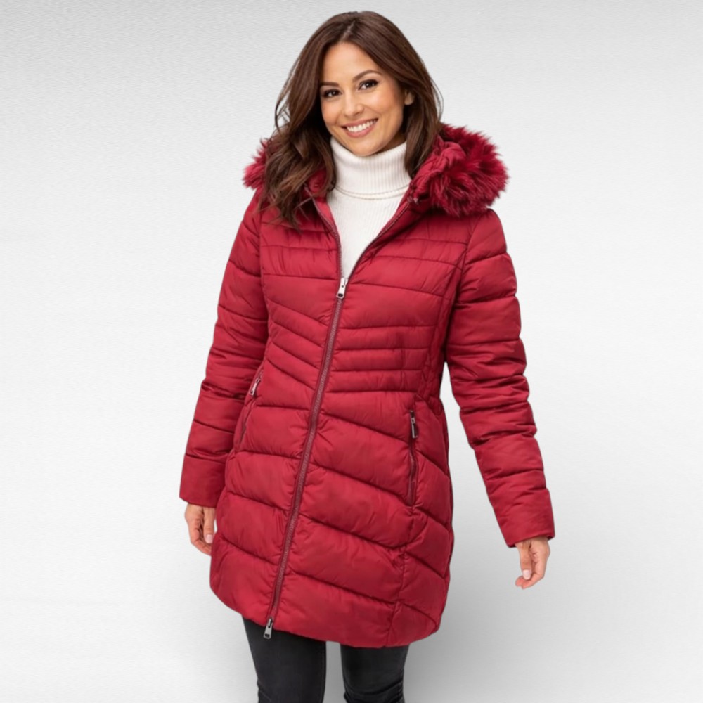 Väga ilusat erkpunast tooni tepitud kilematerjalist soe pikem sügistalvine jope “Dromedar Collection”.  Materjal ei krabise. Keha ülaosa on karvase voodriga. Jope on karvase kraega kapuutsiga, eest kinnitub lukuga, külgedel lukkudega taskud. Keskelt veidi taljes lõige. Pikkus jääb üle poole kintsu. Varrukatel on seespool otstes kumm, hoiab soojalt ümber käe.