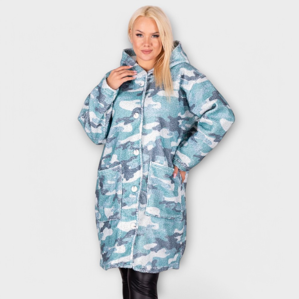 Stiilne ja mugav laigulise mustriga eest nööpidega suurte taskutega veidi karvasest paksemast materjalist kapuutsiga jakk “Nora”. Varrukad on õlast pikendatud ja avarad. Voodrit all ei ole aga on päris soe. Sobib kanda jahedamatel suveõhtutel ja sügisel.