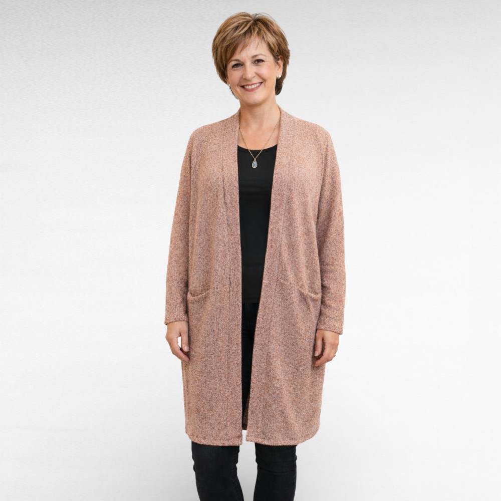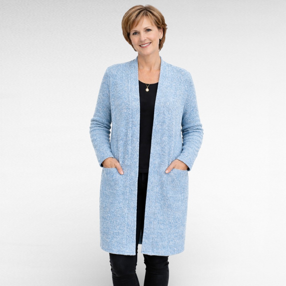 Soe mõnusalt pehmest bukleematerjalist taskutega pikem kardigan Inglismaalt firmalt “Ny Collection”. Hõlmad on eest lahtised. Pikkus jääb umbes põlvedeni.