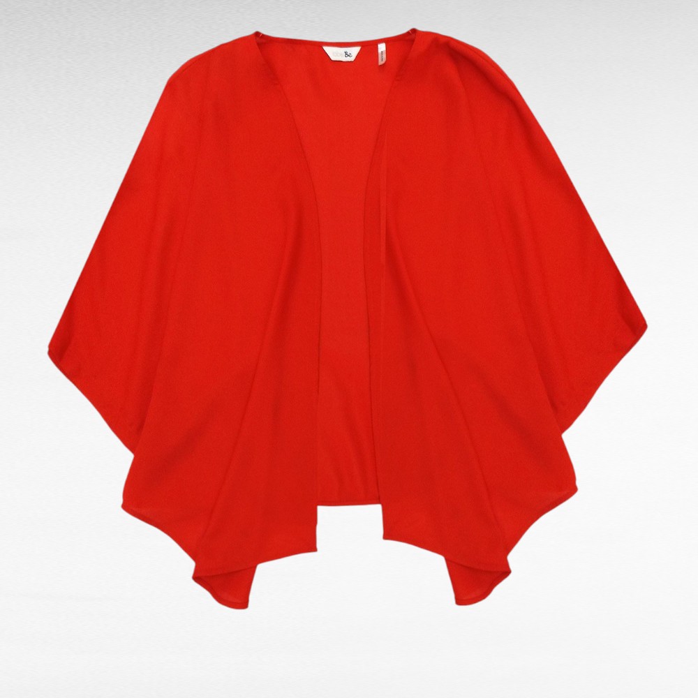 Punane eest lahtiste hõlmadega raglaanlõikega boolero Inglismaalt firmalt “Label Be”. Siidjas õhem kangas. Rinnaosa on avaram kui alt. Tagumine osa on lühem, jääb umbes vöökohani, hõlmad on eest pikemad.
