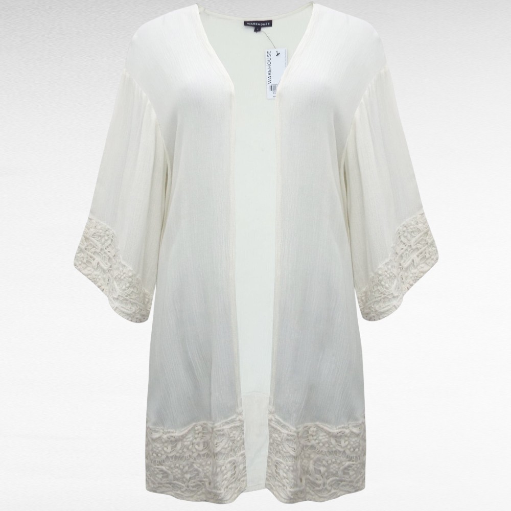 Kreemikasvalge kortsuriidest kardigan Inglismaalt firmalt “Warehouse”. Poolpikad avarad varrukad, allääres ja varruka otstes lai pits.
