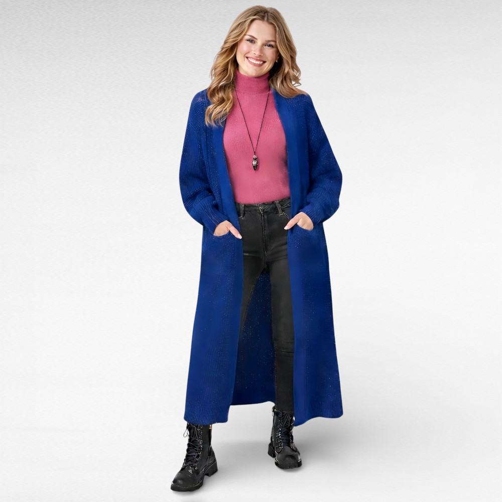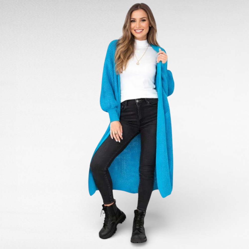 Pikk eest lahtiste hõlmadega pikkade varrukatega  kardigan “Merina”. Pikendatud õlaosa, sirge lõige, külgedel taskud. Väga mõnus jahedamal päeval peale visata.