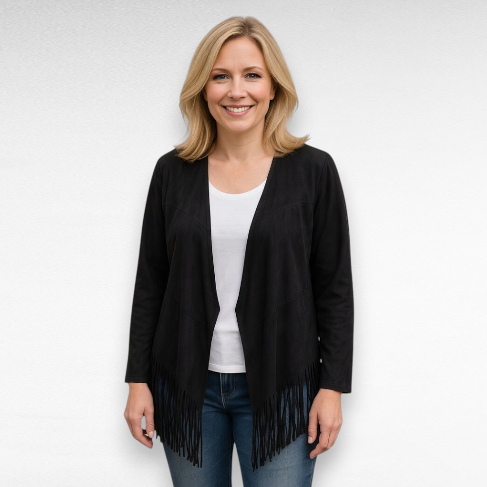 Stiilne must alt narmastega jakk firmalt “Ellos”. Materjal on seemisnahalaadne. Hõlmad on eest lahtised.