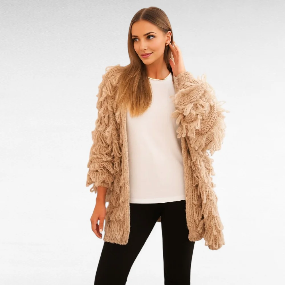 Kogu pinnal kaunistavad kardigani õrnad narmad, mis annavad sellele omanäolise ja elava ilme. See on ideaalne kaaslane nii igapäevasteks koosviibimisteks teksade või retuusidega kui ka kergeks õlasoojendajaks kleidi peale jahedal õhtul. Kardigan toob igasse riietusse eripära ja annab kandjale enesekindla, väljapeetud stiili. Varrukad on õlast pikendatud, jäävad täispikad.