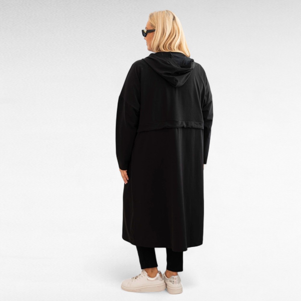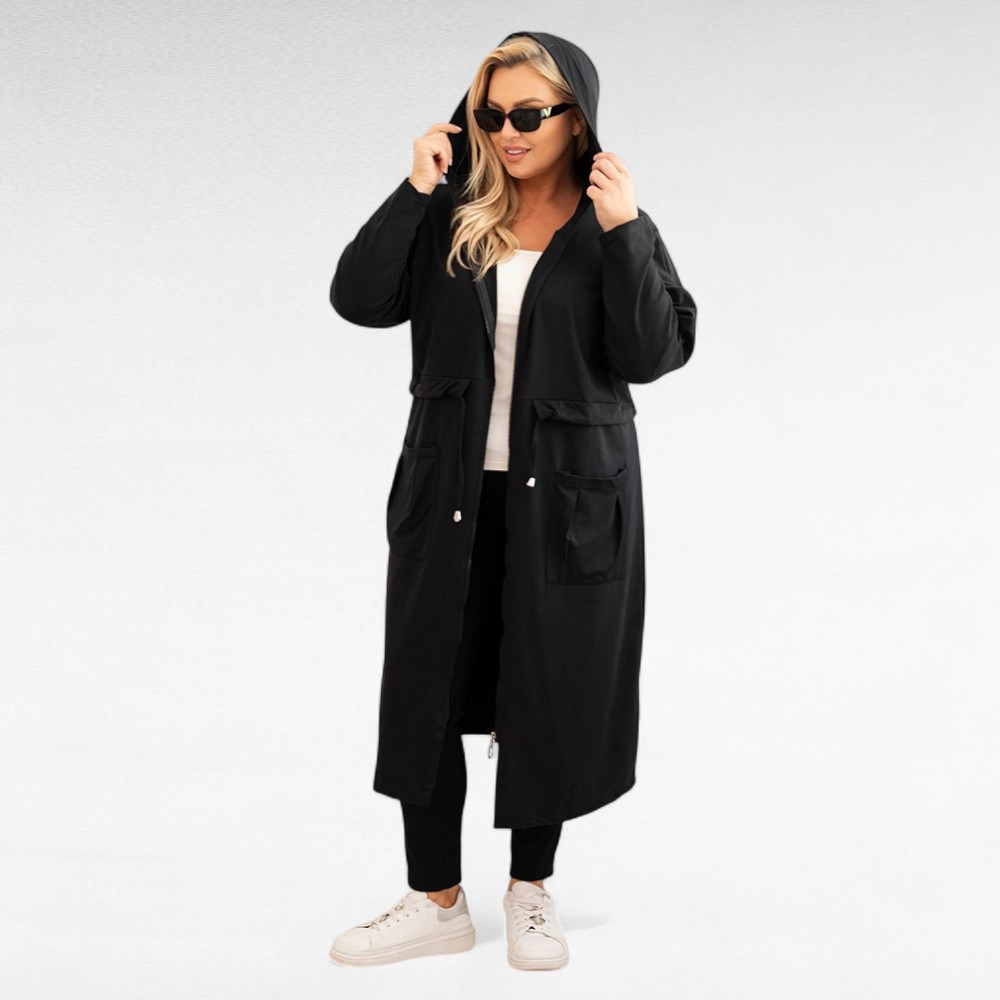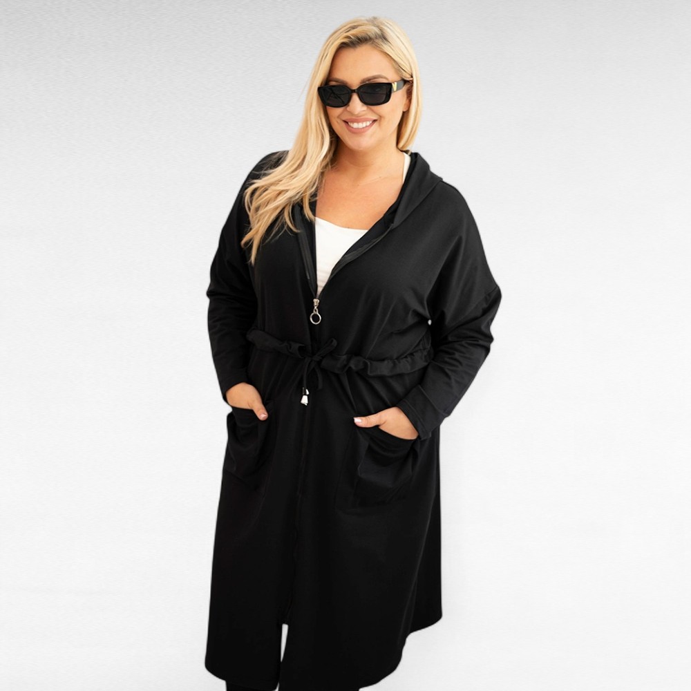 Pikk must kapuutsiga sügisjakk/pusa on mõnusalt pehme ja stiilne kaaslane jahedamateks päevadeks. Reguleeritav tunnelvööga vöökoht aitab rõhutada siluetti, samal ajal kui sügavad taskud ja praktiline kapuuts annavad pusale mugava ja urbanistliku ilme. Varrukad on pikad, õlast veidi pikendatud.