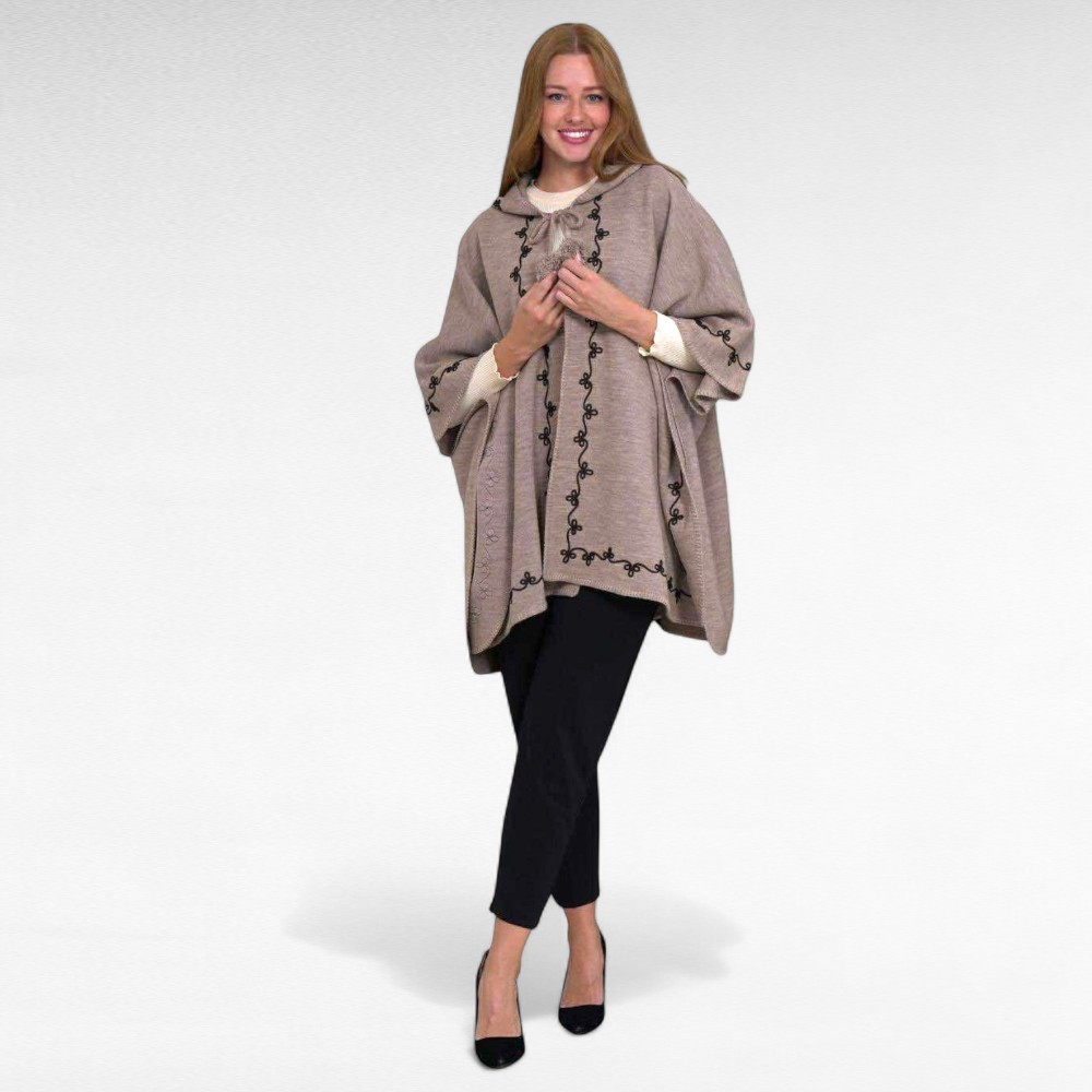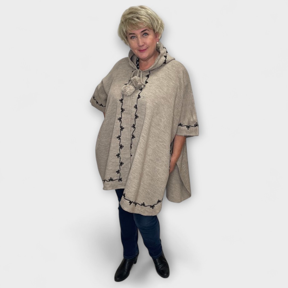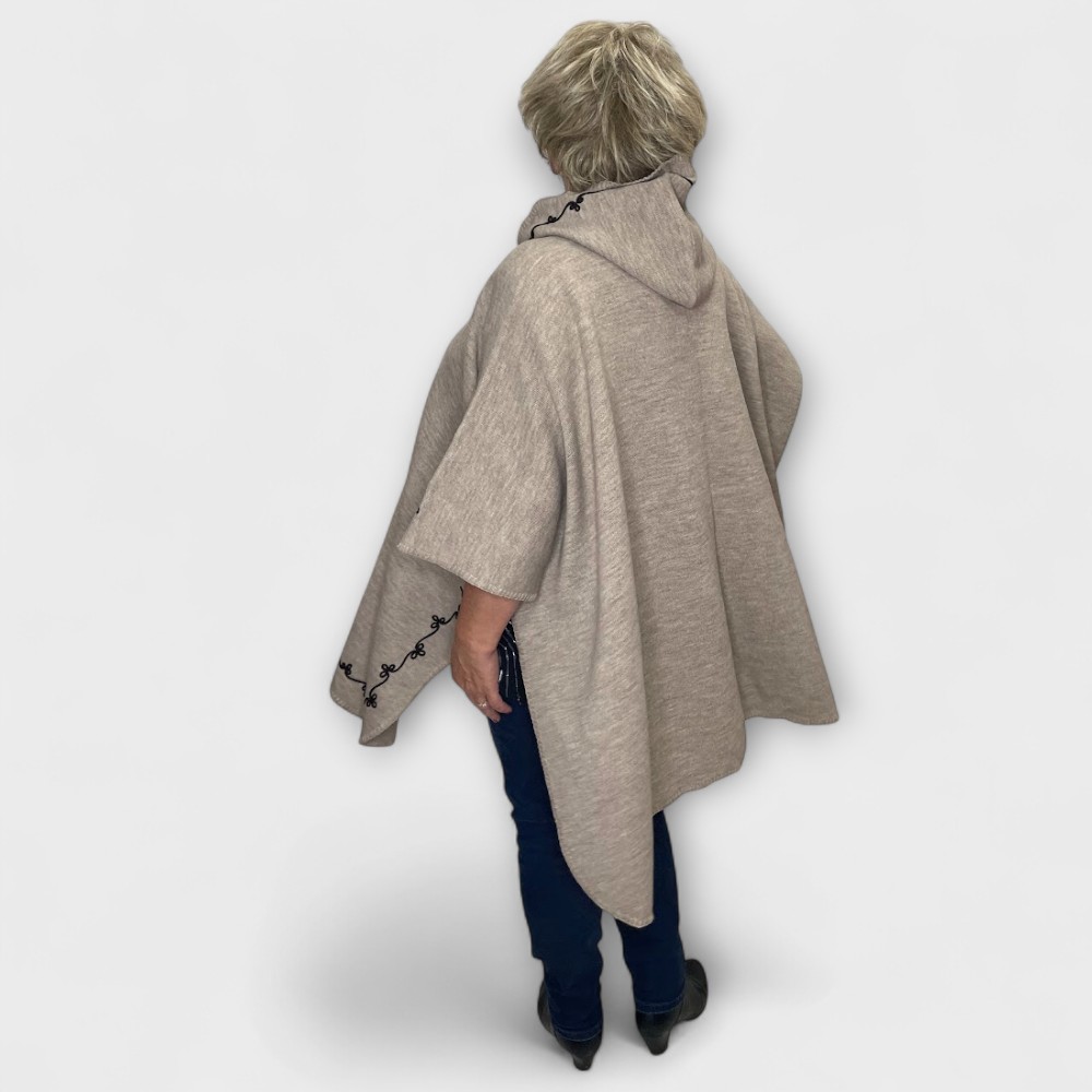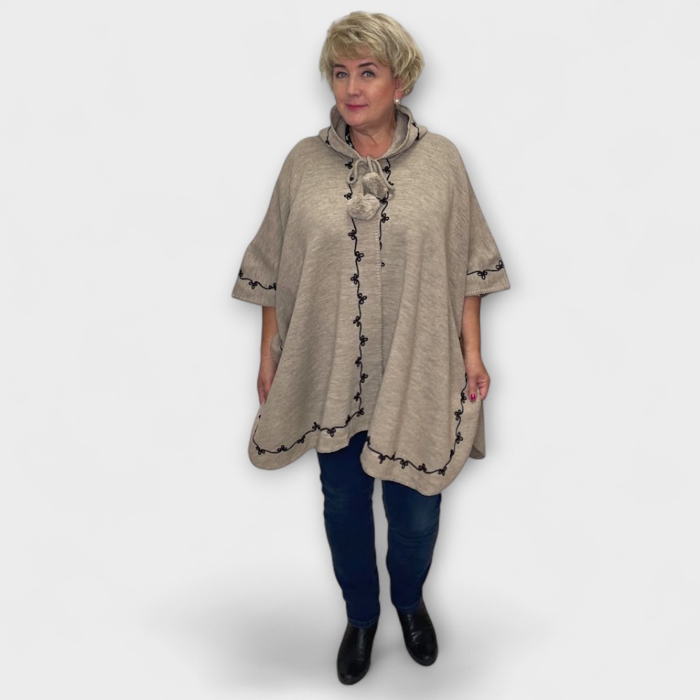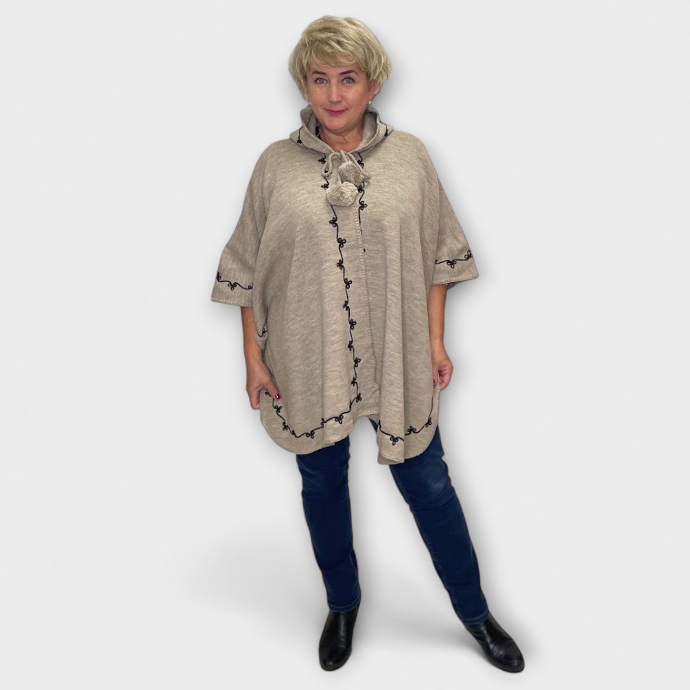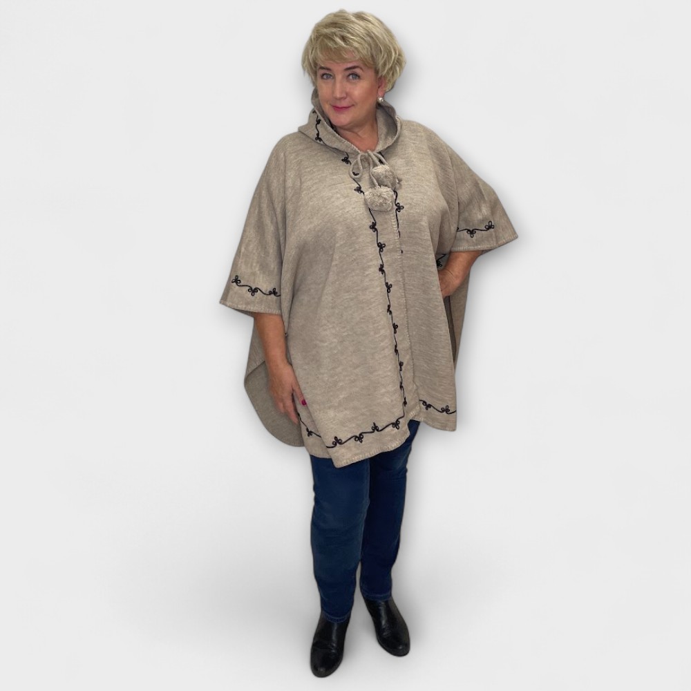 See tumedamat beeži tooni kapuutsiga pontšo on tõeline pilgupüüdja, mis ühendab mugavuse ja romantilise ilme. Kaunistuseks on mustad käsitöötikandid, mis lisavad igale sammu kergust ja šarmi. Pontšo varrukad on alt diskreetselt kokku õmmeldud, et tagada praktiline ja kaunis kuju. Hõlmad on eest lahtised ja need saab kokku siduda kaeluse juuresolevate armsate paeltega, mille otstes on suured ümmargused tutikesed – justkui väikesed rõõmuhetked sinu riietuses. Tagant on pikem kui eest ja altäär on kauni kaarja lõikega, mis langeb pehmelt ja naiselikult.