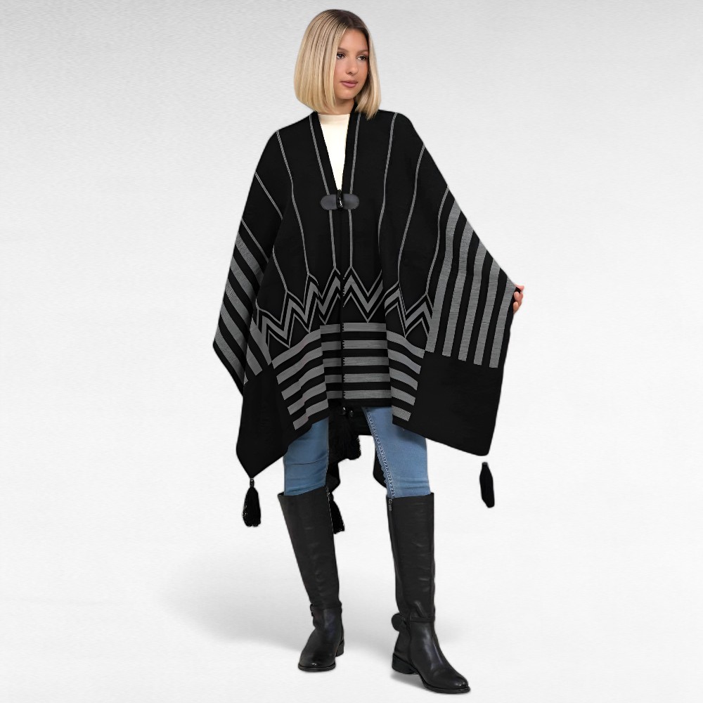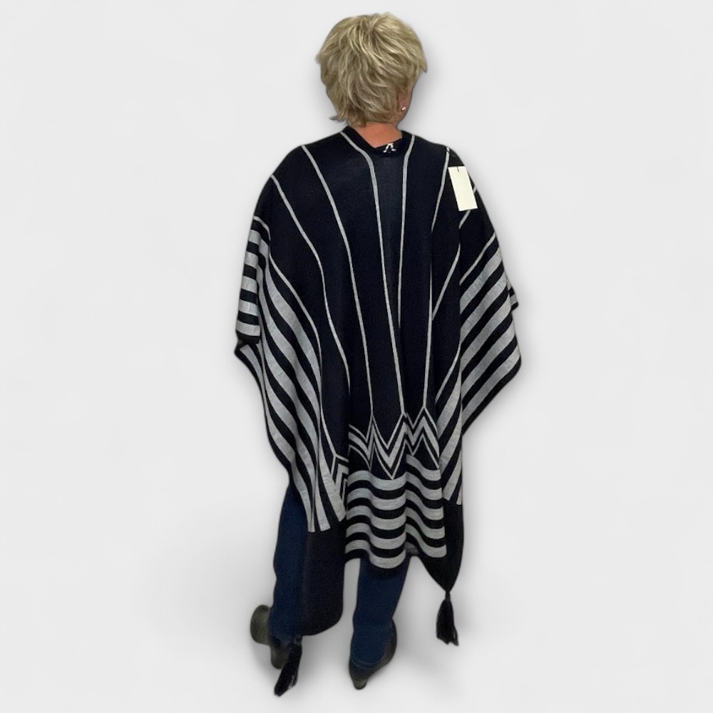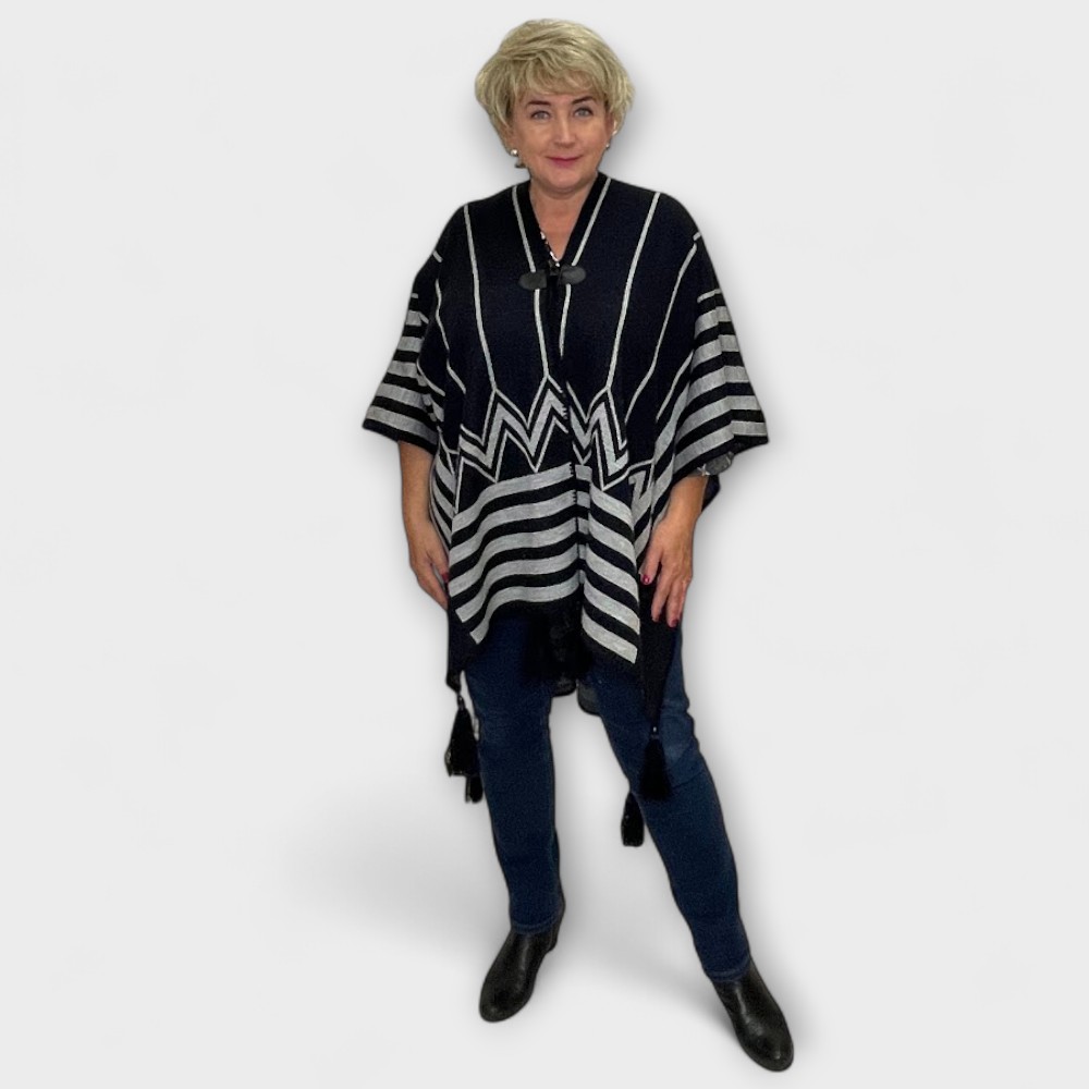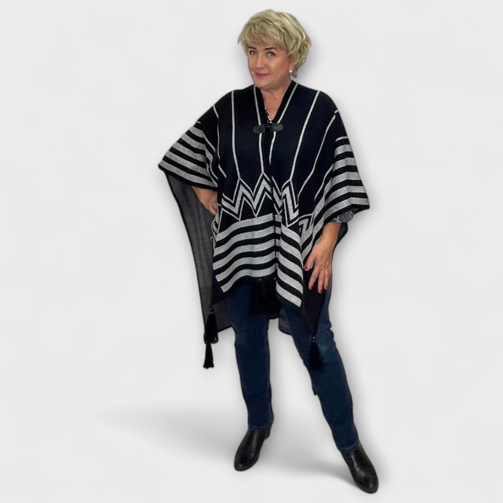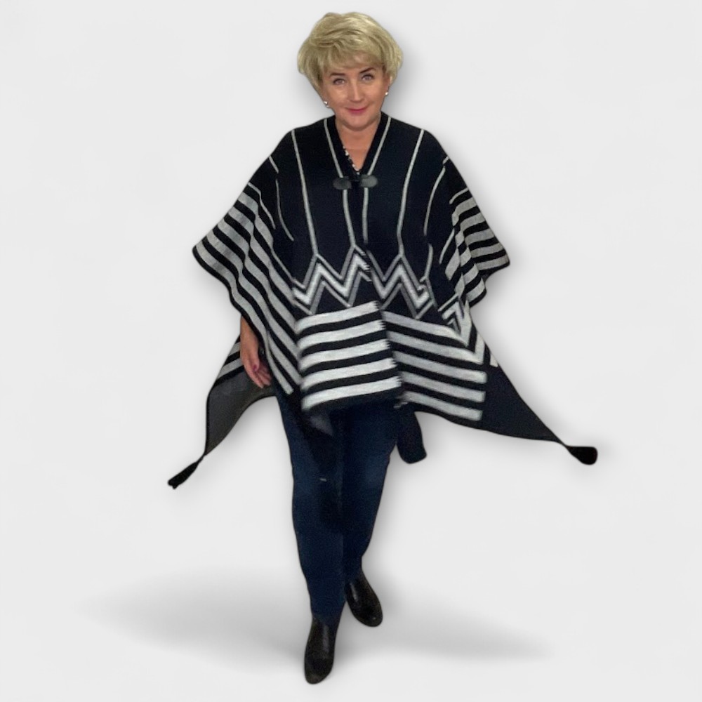 See musta ja-hallitriibuline pontšo on tõeline pilgupüüdja – sakiline muster ja elegantsed jooned loovad šiki ja ajatu välimuse. Pontšo on valmistatud soojast ja pehmest materjalist (70% akrüül, 30% vill), mis paitab nahka ja pakub mugavust igal aastaajal.