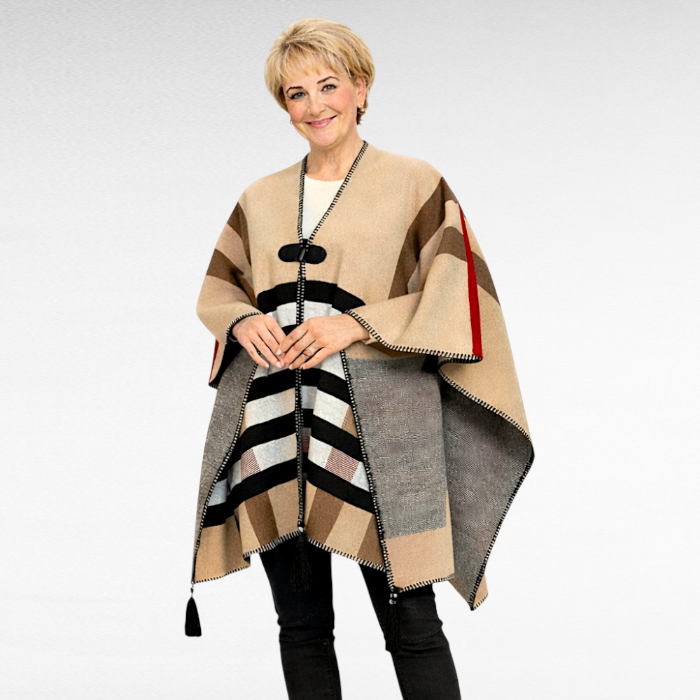 See beežides toonides pontšo on tõeline moepärl – burberry stiilis punase-, musta- ja valgeruuduline mustrimäng toob esile modernse ja šiki välimuse, samas kui soe ja pehme materjal (70% akrüül, 30% vill) pakub luksuslikku mugavust igal aastaajal.