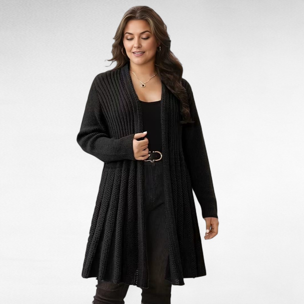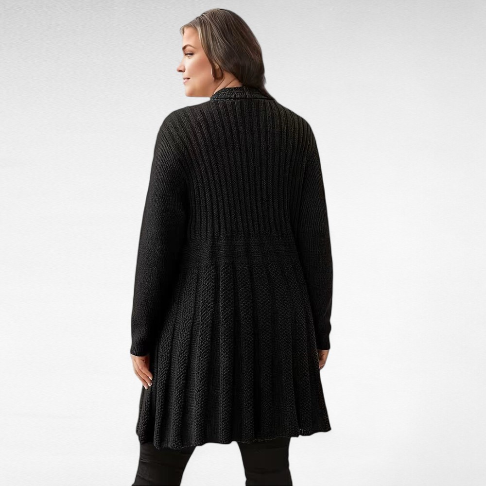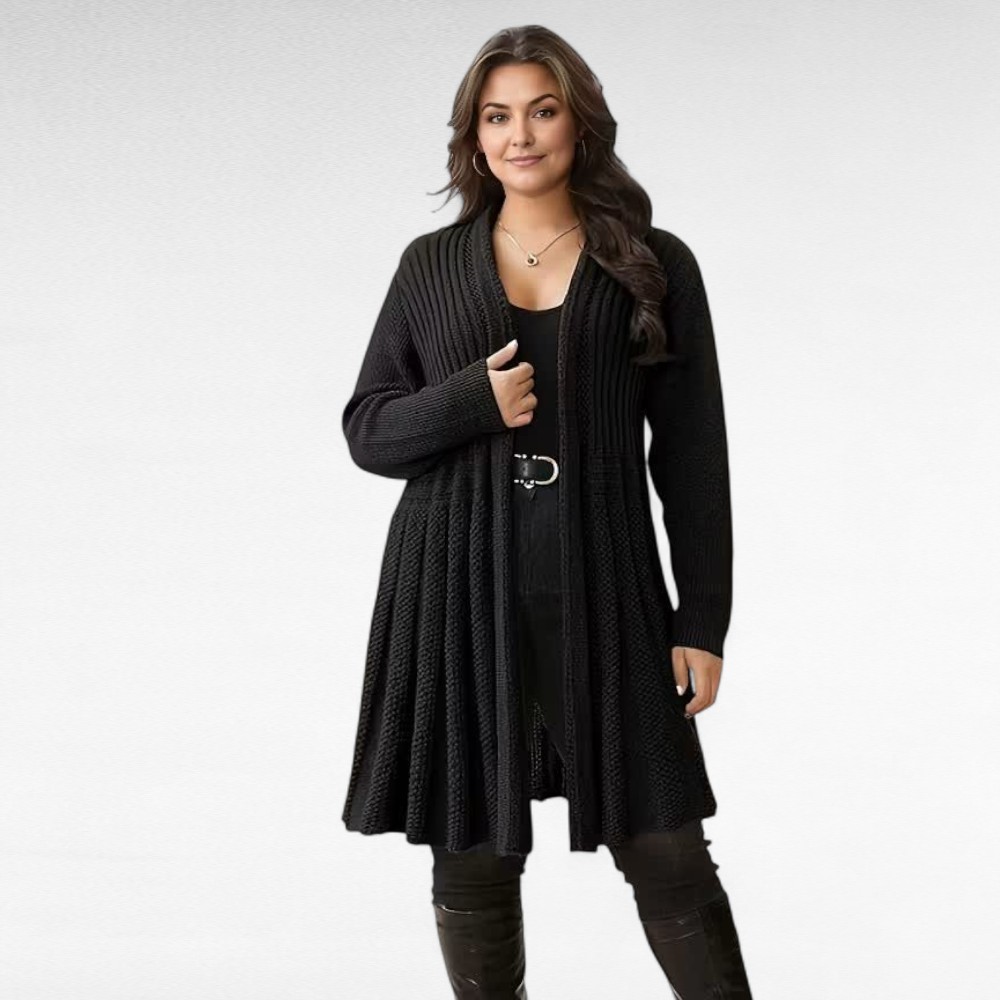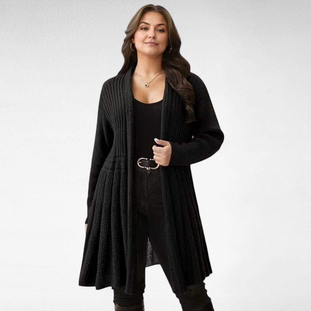 Kaunis must naiselik keskelt taljes ja alt veidi laieneva lõikega pikk kardigan “Julietta”. Pikkus jääb umbes põlvedeni. Vöökoht on keskelt läbilõikega ja alumine osa on vabaltlangev ja lainetav. Varrukad on pikad ja õlaosa on veidi pikendatud. Varruka pikkus on mõõdetud kaelusest.