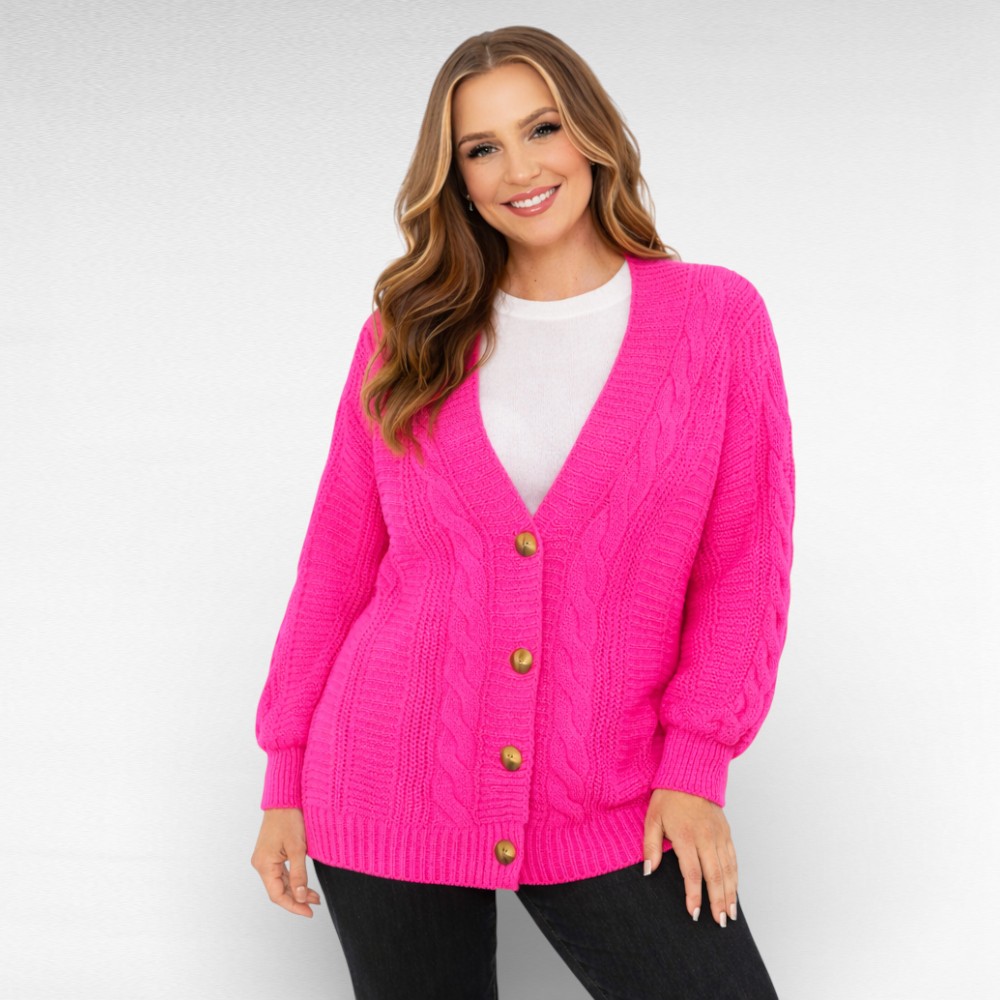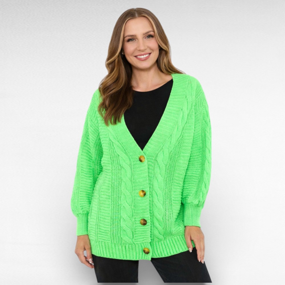 Palmikkoes kootud eest nööpidega pehme V-kaelusega kardigan firmalt “Kesi”. Pikendatud õlaosaga avarad puhvis varrukad. Altäär ja varrukaotsad on soonikkoes.