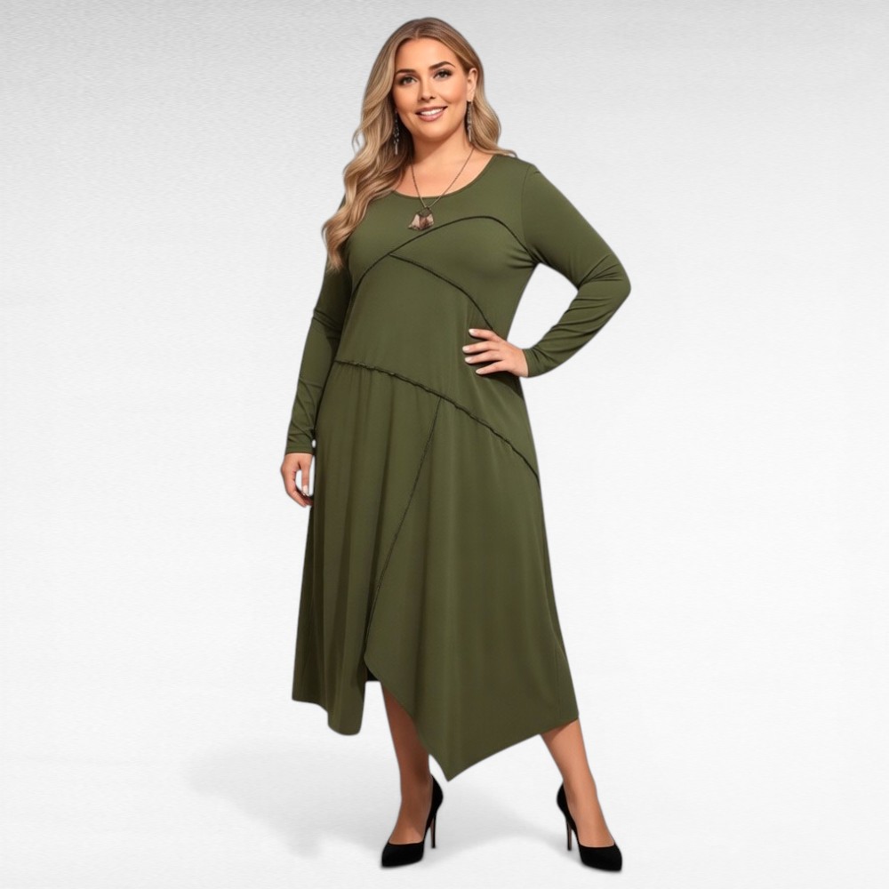 Vabasta oma stiil asümmeetrilise moekuse kaudu! See khakiroheline pluss suuruses naite kleit on pehmest ja venivast materjalist-unistus, mis mängib joone ja vormiga. Viltused õmblused ja julge läbiõmmeldud viimistlus loovad visuaalse põnevuse – ideaalne valik, kui armastad rõivaid, mis on sama ainulaadsed kui Sina ise.