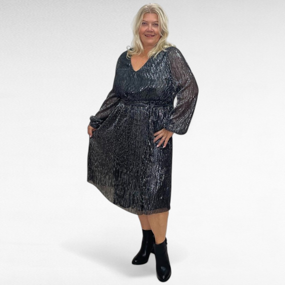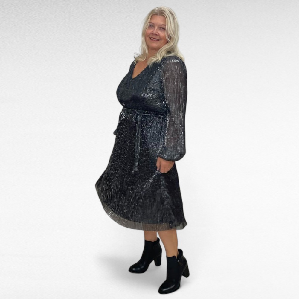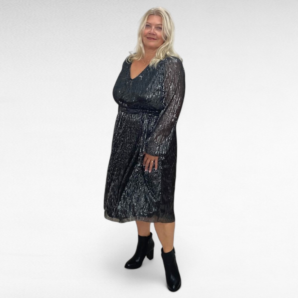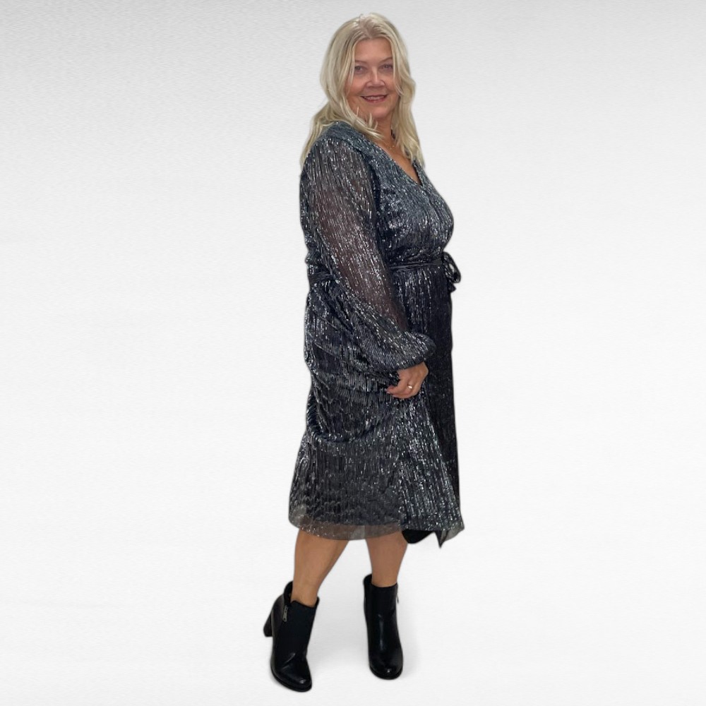 See Inglismaa “Yours Collection” hõbedaselt sillerdav kleit on loodud naisele, kes hindab elegantsi, mugavust ja enesekindlust. Siidjas läikega kangas haarab valguse endasse ning toob esile Sinu sisemise sära – olgu see siis pidulik õhtusöök, juubel või eriline õhtu sõpradega.