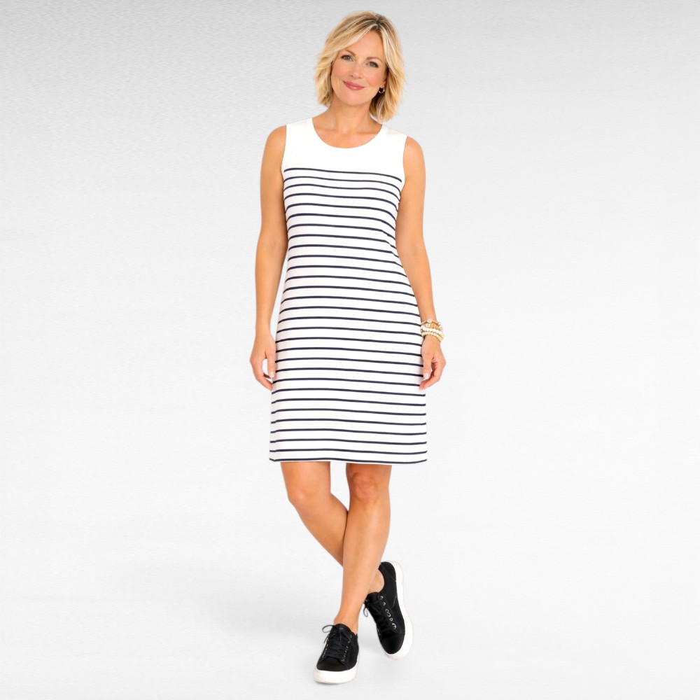 Ülimõnusast strethcikast kangast valge põhja peal sinisetriibuline kleit firmalt “Seppälä”. Keskelt natuke taljes, puus avar. Kuni 165cm pikkuseni jääb nagu lühem kleit, pikematel juba rohkem nagu tuunika. Palun jälgige kleidi pikkust!
