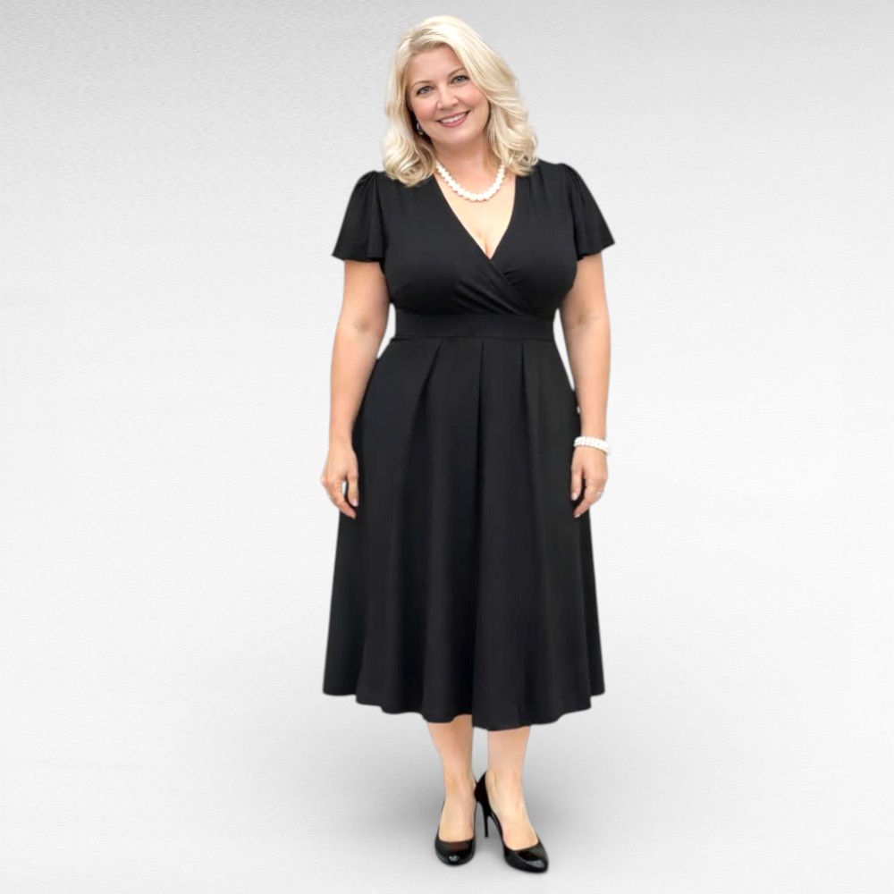 Hästi mõnusast stretchikast materjalist väikeste satsiliste varrukatega musta värvi rinnaosast hõlmikkaelusega alt laienev kaunis kleit Inglismaalt firmalt “Mia Moda”. Vöökoht on läbilõikega ja seelikuosa on eest kroogitud voltidega, puus on avar. Pikkus jääb allapoole põlve. Materjal on väga hea, venib, langeb hästi ja ei kortsu.