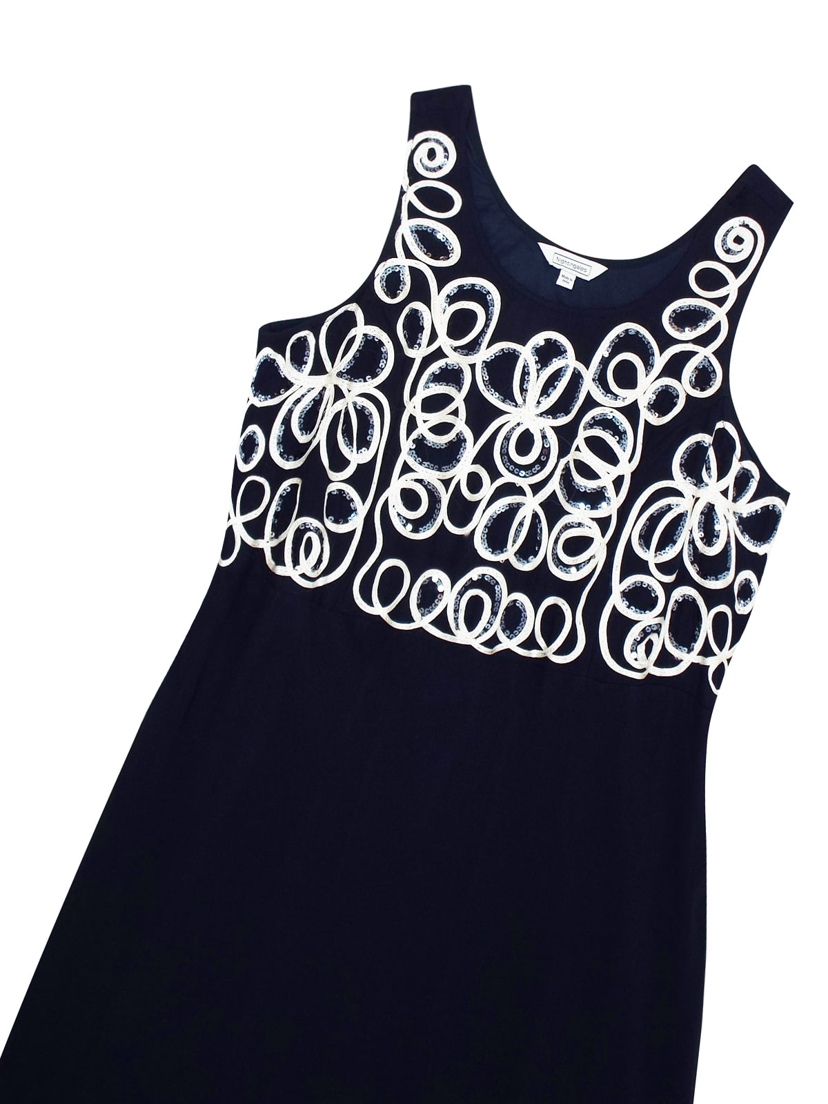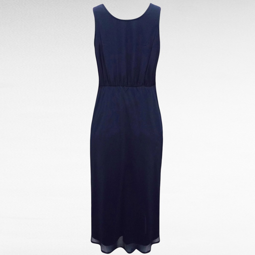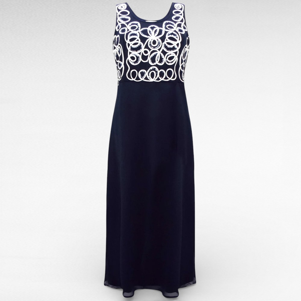 Väga kaunid mustjassinised rinna pealt hõbedase paelaga tikitud ja sätendavate litritega kaunistatud ilma varrukateta alt voodriga kleidid Inglismaalt firmalt “Nightingales”. Vöökoht on selja tagant kummiga ja kroogitud, puus on vaba. Pikkus jääb üle poole sääre.