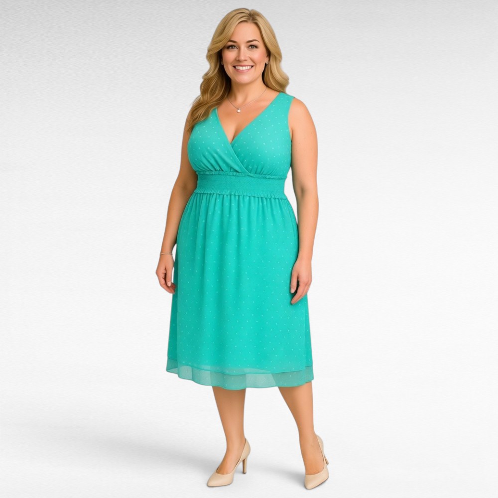 Kaunis õhulisest sifoonkangast mitmekihiline tagant umbes 15cm pikema sabaosaga keskelt laia kummivööga pluss suuruses naiste kleit Inglismaalt firmalt “Mlle Gabrielle”. Eest hõlmiklõikega rinnaosa, all on vooder, läbi ei paista. Toon on roheline, seest armas säbruline muster. Keskelt on kroogitud ja puusaosa on avar. Sobib kanda nii igapäevaselt kui väike sall peal ka pidulikul puhul.