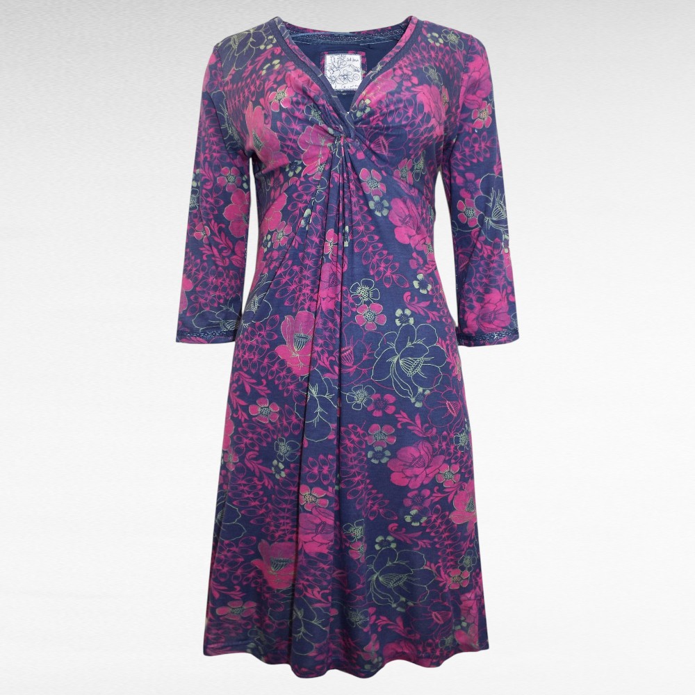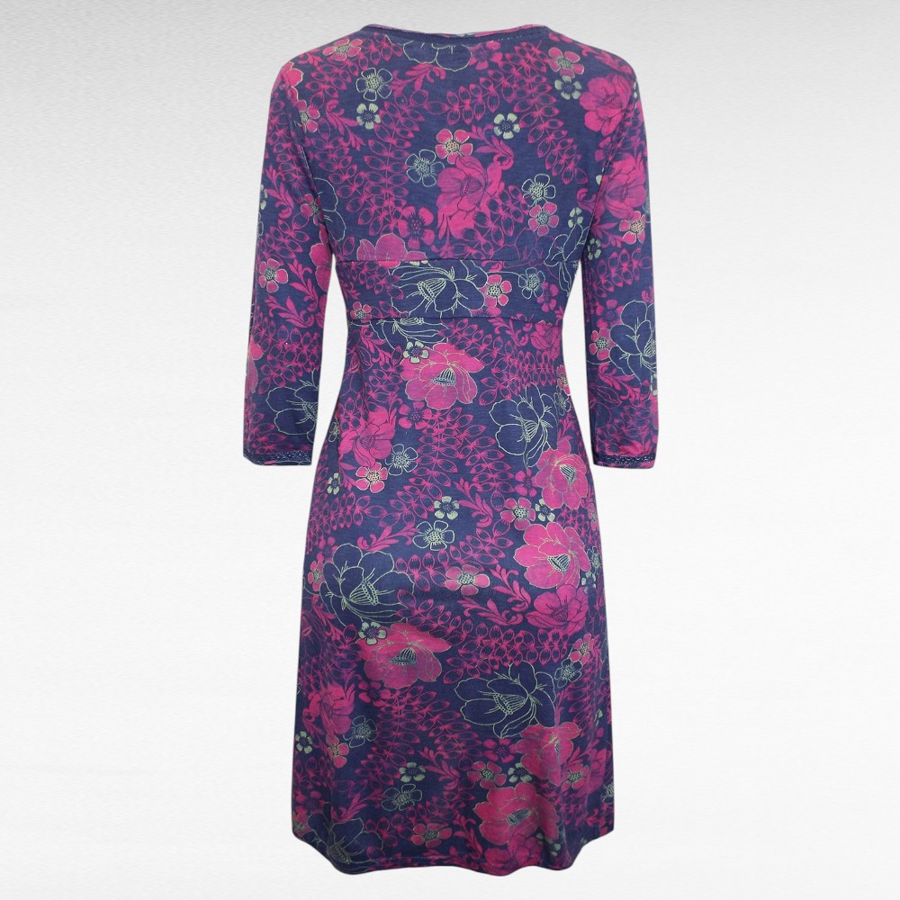 Kaunis lilla- ja roosakirju mustriga V-kaelusega, poolpikkade varrukatega, rinna alt läbilõike ja sõlmega igapäevane kleit Inglismaalt firmalt “Fat Face”. Mõnus nahasõbralik mittekortsuv materjal.