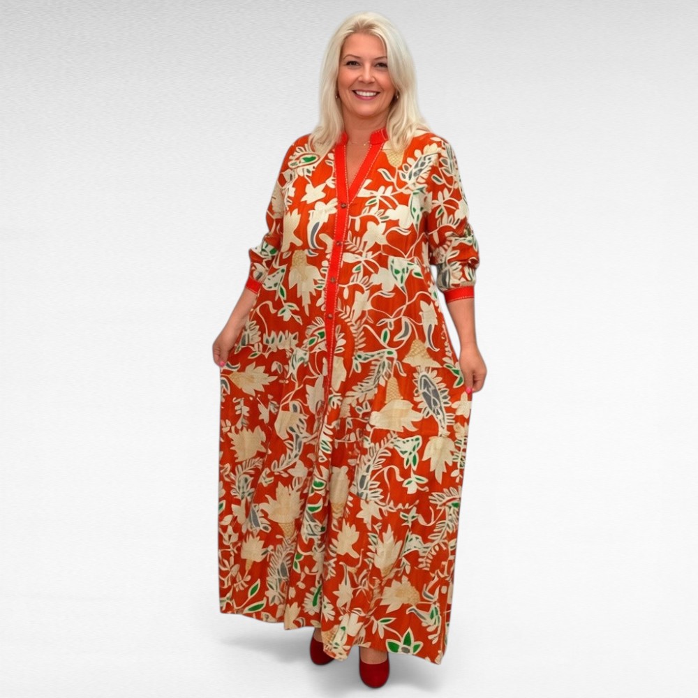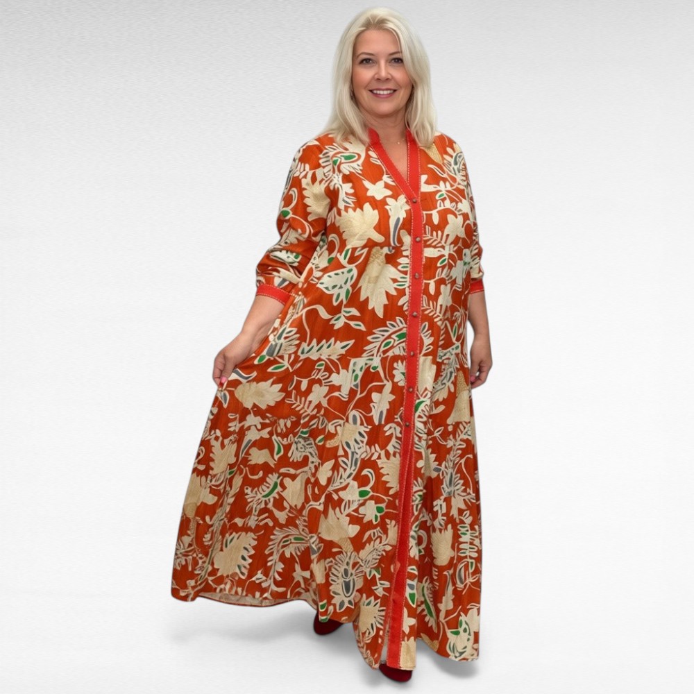 Valmistatud 100% kvaliteetsest puuvillast, on see kleit hingav, kerge ja nahasõbralik – just see, mida vajad soojadel päevadel. Avar, laienev maxi-lõige tagab liikumisvabaduse ning rõhutab loomulikku elegantsi. Täispikk nööbirida muudab kleidi selga panemise lihtsaks ja praktiliseks, samas kui boheemlaslik muster annab kleidile erilise iseloomu.