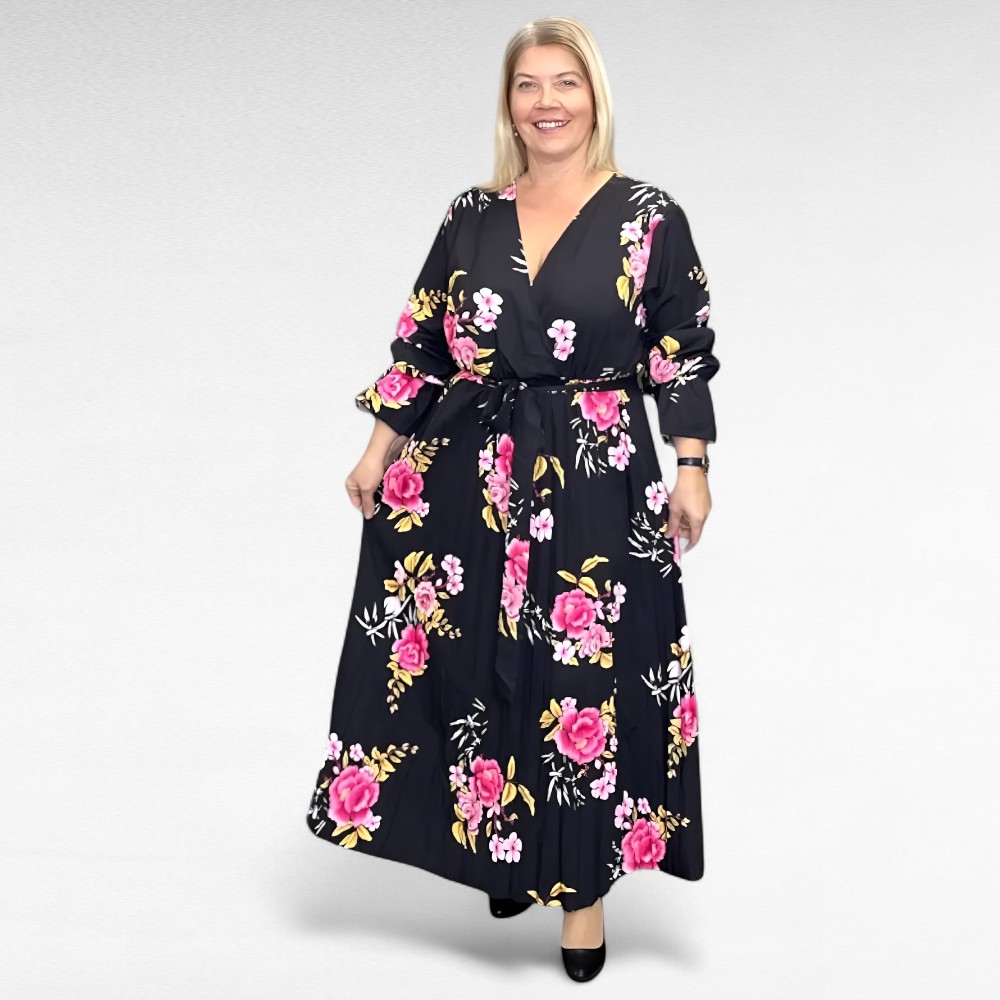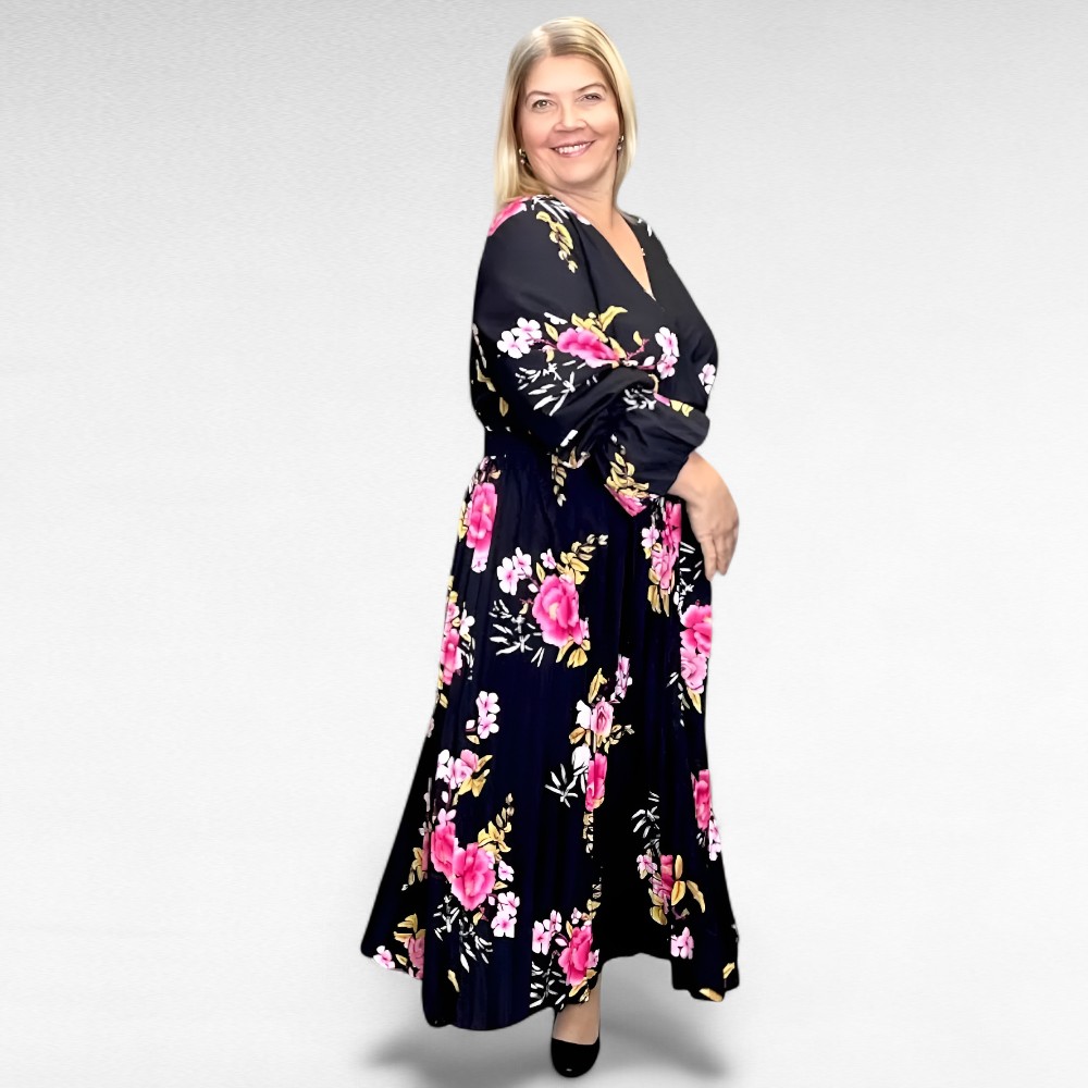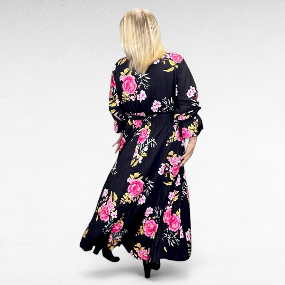 Väga kaunis ja luksuslik siidjast hästilangevast materjalist musta põhja peal suure efektse roosakirju lillemustriga seelikuosast plisseeritud pikk kleit “Marimel”. Rinnaosa on V-kujulise hõlmiklõikega, keskel läbilõige ja vöö. Vöökohast on kõvasti kroogitud ja puusaosa on avar ning vabaltlangev. Pikad avarad varrukad.