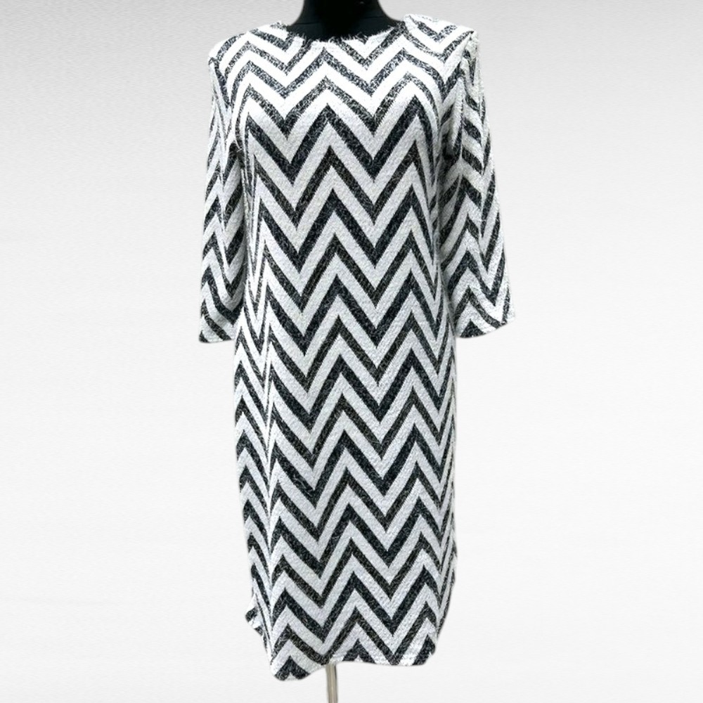 Mõnus pehme ja karvane efektse musta- ja valgekirju sakilise mustriga sügistalvine poolpikkade varrukatega kleit “Darja”.