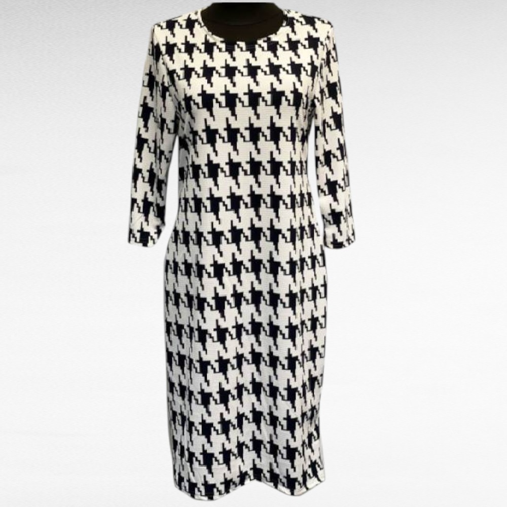 Musta- ja valgekirju geomeetrilise mustriga veidi tekstuursest krobelisest kangast poolpikkade varrukatega, sirge lõikega sügistalvine kleit. Hea materjal, langeb hästi, ei kortsu ega liibu. Pikkus jääb veidi allapoole põlve.