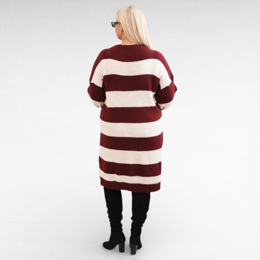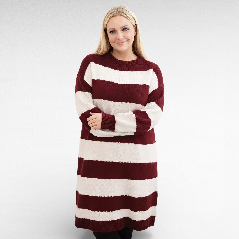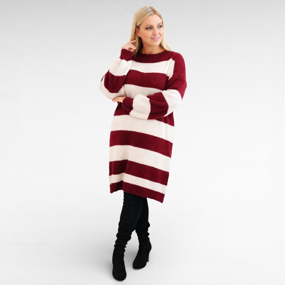 Julged horisontaalsed veinpunased ja valged triibud annavad kleidile iseloomu ja ajatu ning modernse ilme. Ümar kaelus ja pikendatud õlajoon rõhutavad trendikat oversized-stiili. Põlveni ulatuv pikkus ja pikad varrukad teevad sellest suurepärase sügistalvise kleidi. Varrukad on avarad ja otsast soonikuga. Sobita seda nii poolsaabaste või kõrge säärega saabastega, soovi korral lisa vöö, et tuua siluetti rohkem naiselikkust.