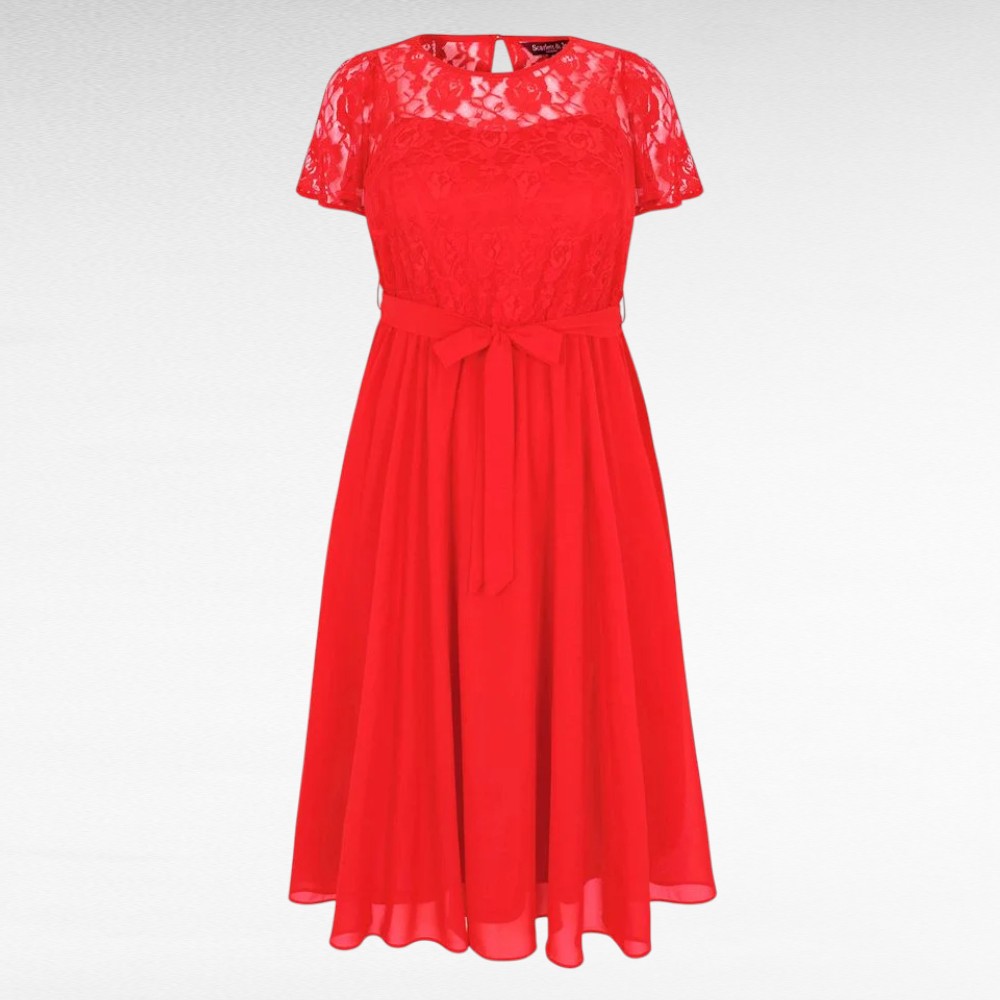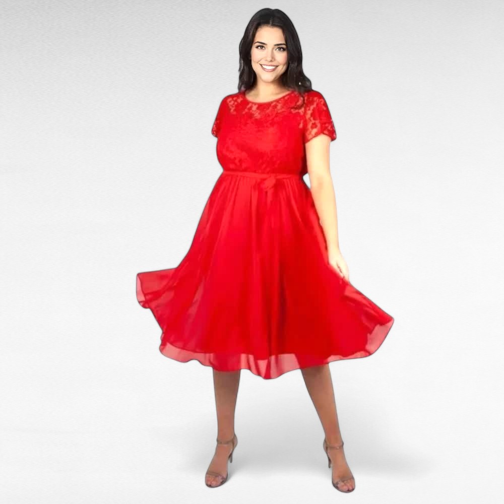 Kaunis õhulisest sifoomaterjalist pidulikud ülevalt pitsilise osaga punased keskelt kummiga ja alt laieneva seelikuosaga vööga kleidid Inglismaalt kuulsalt brändilt “Scarlett and Jo”. Ülaosas on reguleeritavate õlapaeltega top ja seelikuosas vooder. Midagi liigset läbi ei paista. Selja taga nööbikinnitus. Kaunid pitsilised lühikesed varrukad.
