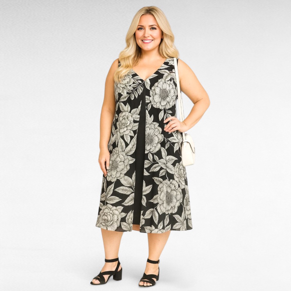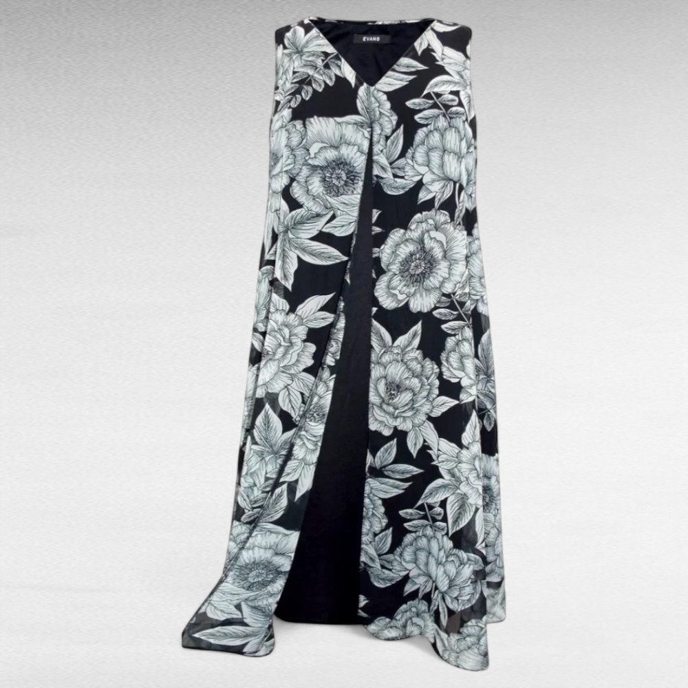 Ideaalne kleit naisele, kes tahab rõhutada vaid oma paremaid külgi 🙂 Naiselik kahekihiline must valgekirju suure lillemustriga kleit Inglismaalt firmalt “Evans”. Alumine osa on venivast materjalist, peal eest lahtine polüestematerjalist kangas. Pikkus jääb veidi üle põlve. Varjab kõik, mida näidata ei raatsi ja istub seljas lihtsalt suurepäraselt.