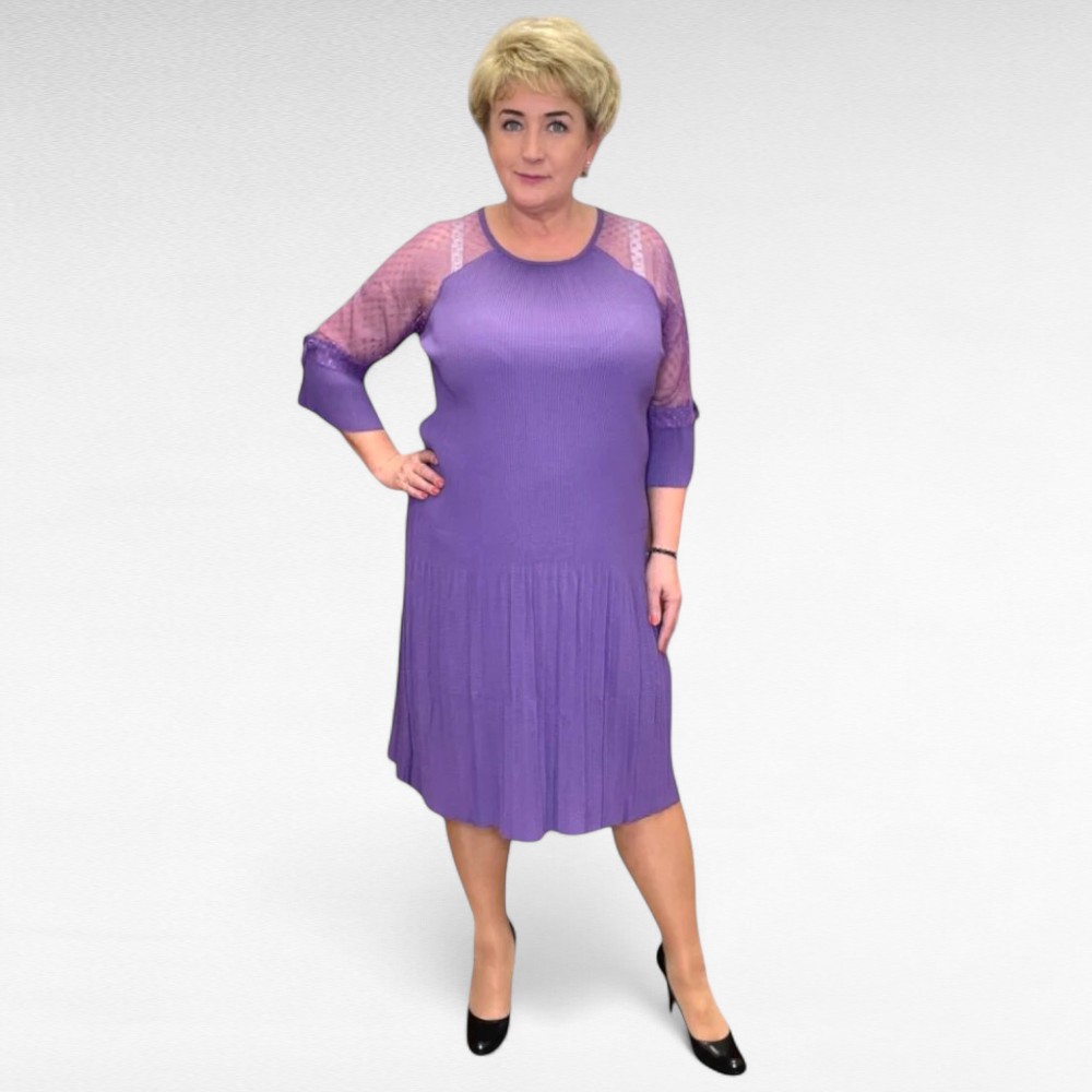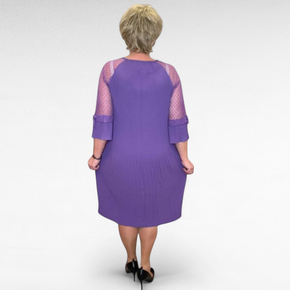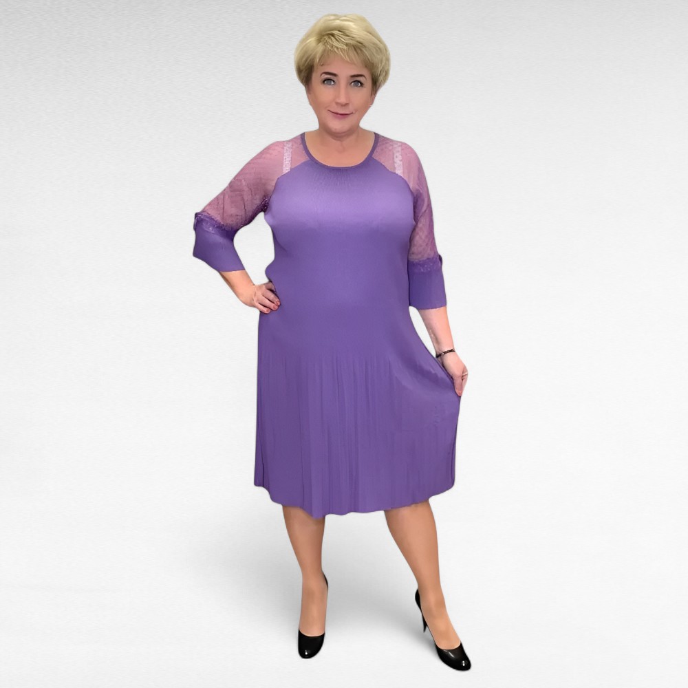 Naiselik sirelililla raglaanlõikega, poolpikkade pitsiliste varrukatega Womanary plisseerkleit “Karmelia”. Ülaosa on peenikese plisseeriga ja alumine laiema plisseeriga. Pehme veniv materjal. Pikkus jääb natuke üle põlvede.