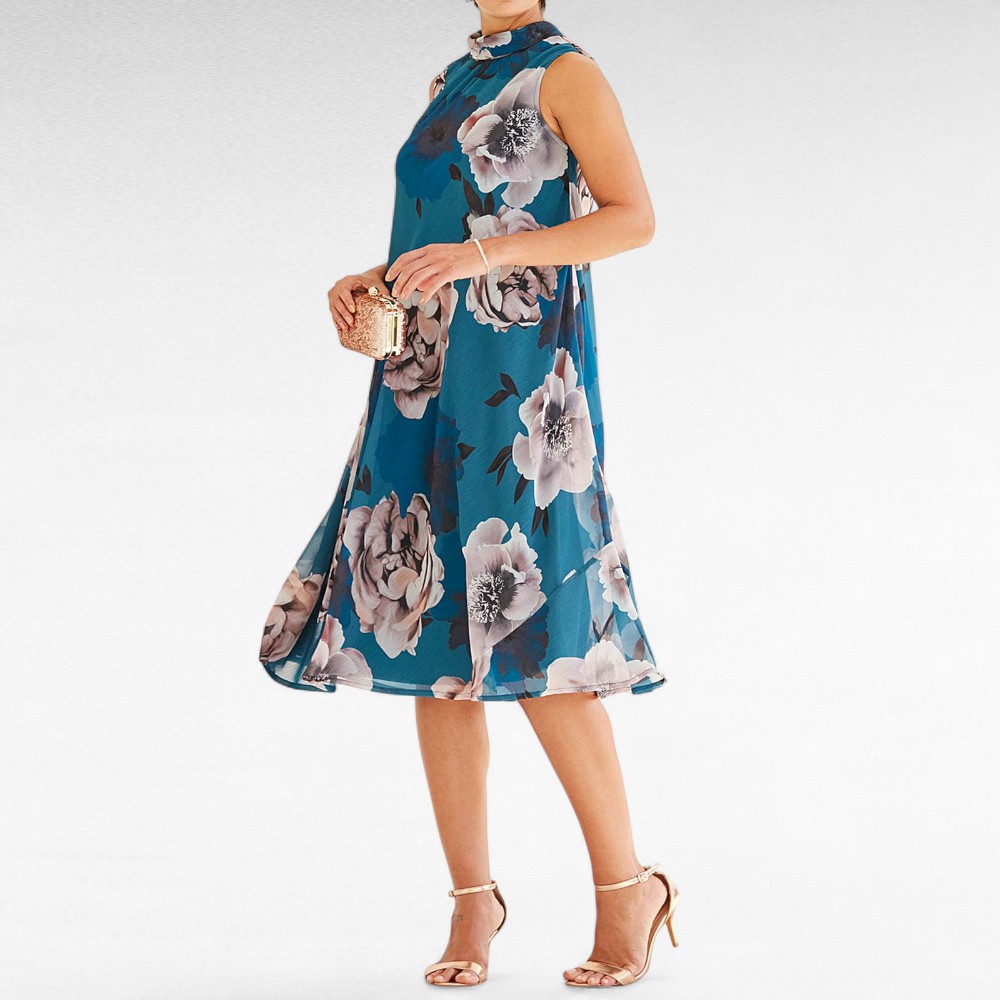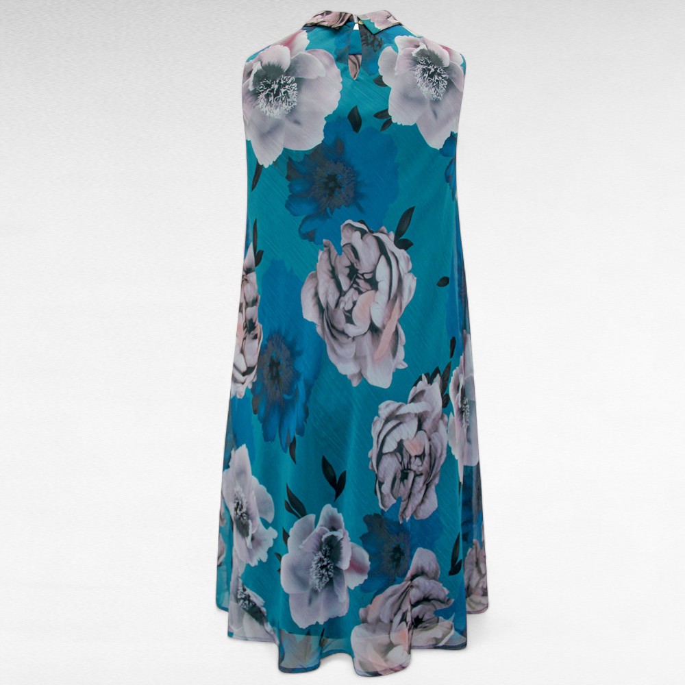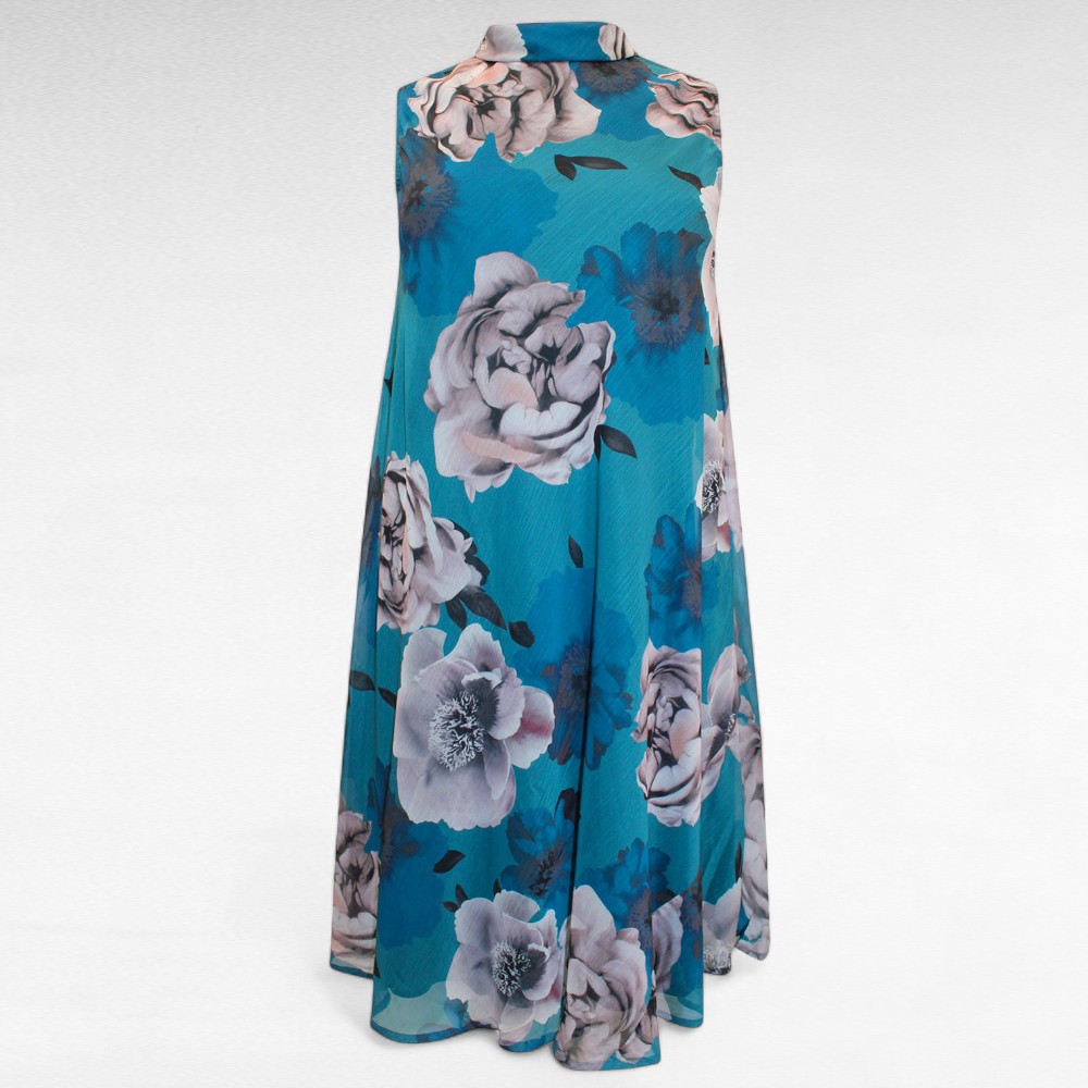 Kaunis õhuline alt voodriga kinnise kaelusega mereroheline suure efektse heleda lillemustriga alt kõvastilaieneva lõikega kleit Inglismaalt firmalt “Joanna Hope”. Selja taga üleval väike nööbikinnitus.