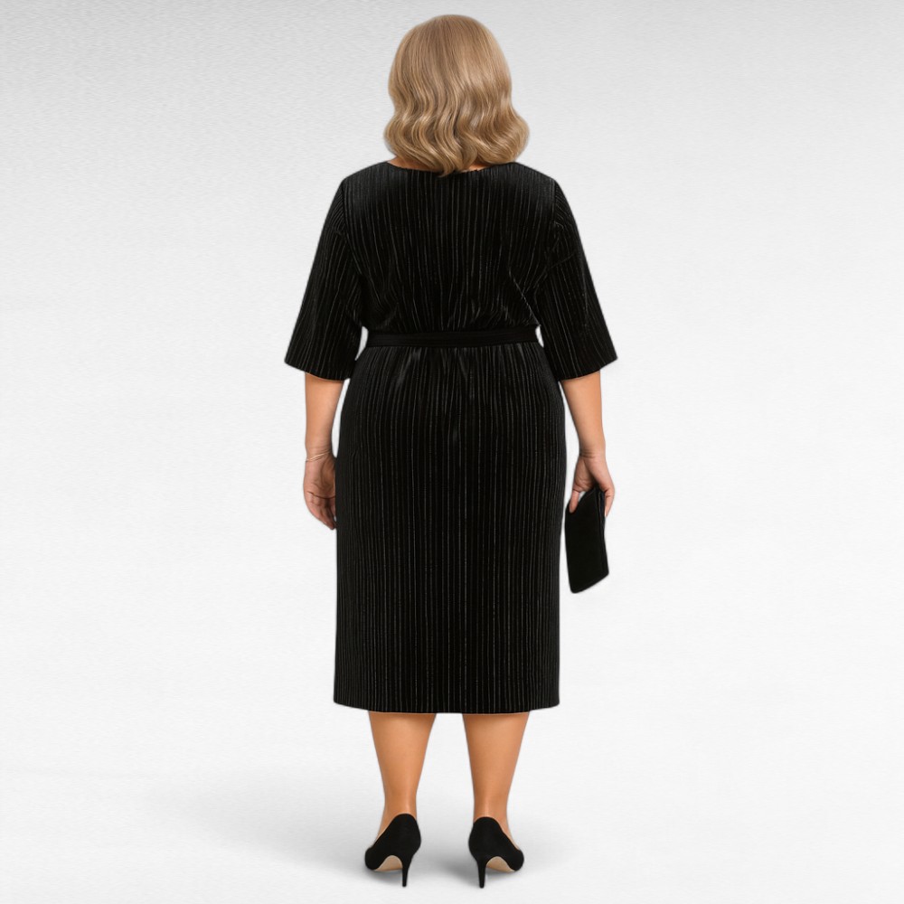 Sära igal üritusel selle kauni pluss suuruses kleidiga, mis ühendab pidulikkuse, mugavuse ja naiseliku enesekindluse. Luksuslikust mustast sametist keskelt läbilõikega vööga kleit on loodud naisele, kes hindab klassikat, kuid soovib samas tunda end vabalt ja kaunina kogu õhtu vältel.