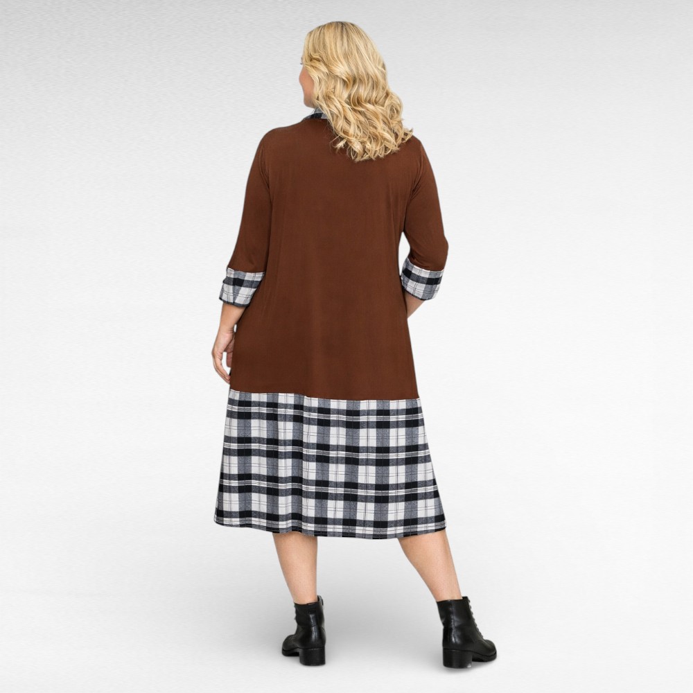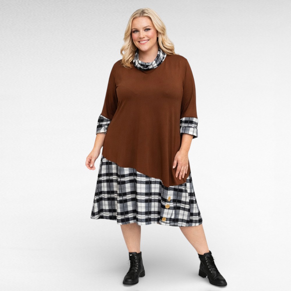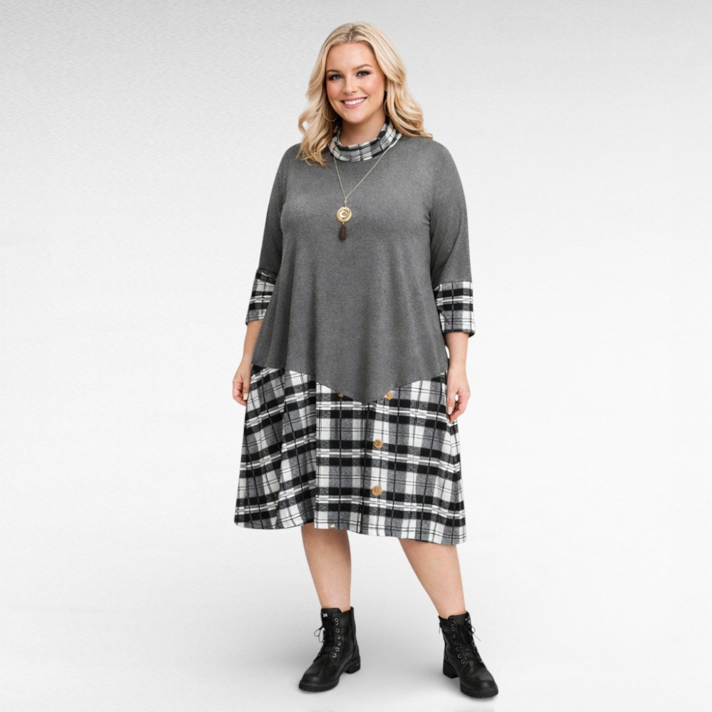 Mõnus pehme halliruudulise mustriga rullkaelusega, pikkade varrukatega kleit “Marite”. Tegumood on alt laienev, pikkus jääb poole sääreni. Allääres seelikuosal kaunistuseks nööbid. Väga kena ja naiselik kleit.