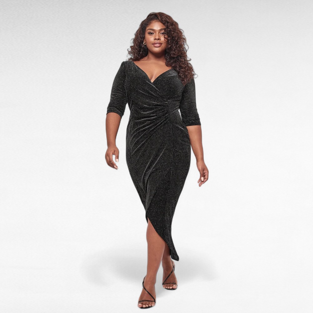 Väga pidulik must hõbehalli sätendava läikega, poolpikkade varrukatega, rinnaosast hõlmiklõikega, eest kroogitud pikk pidulik kleit Inglismaalt firmalt “Sclarett and Jo”. Eest on lühem kui tagant-eest jääb pikkus umbes põlvedeni.