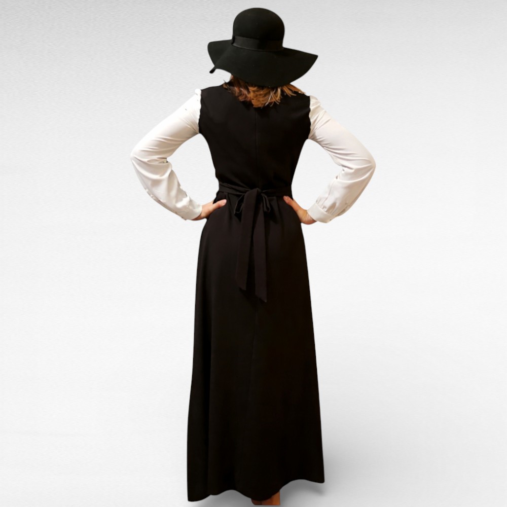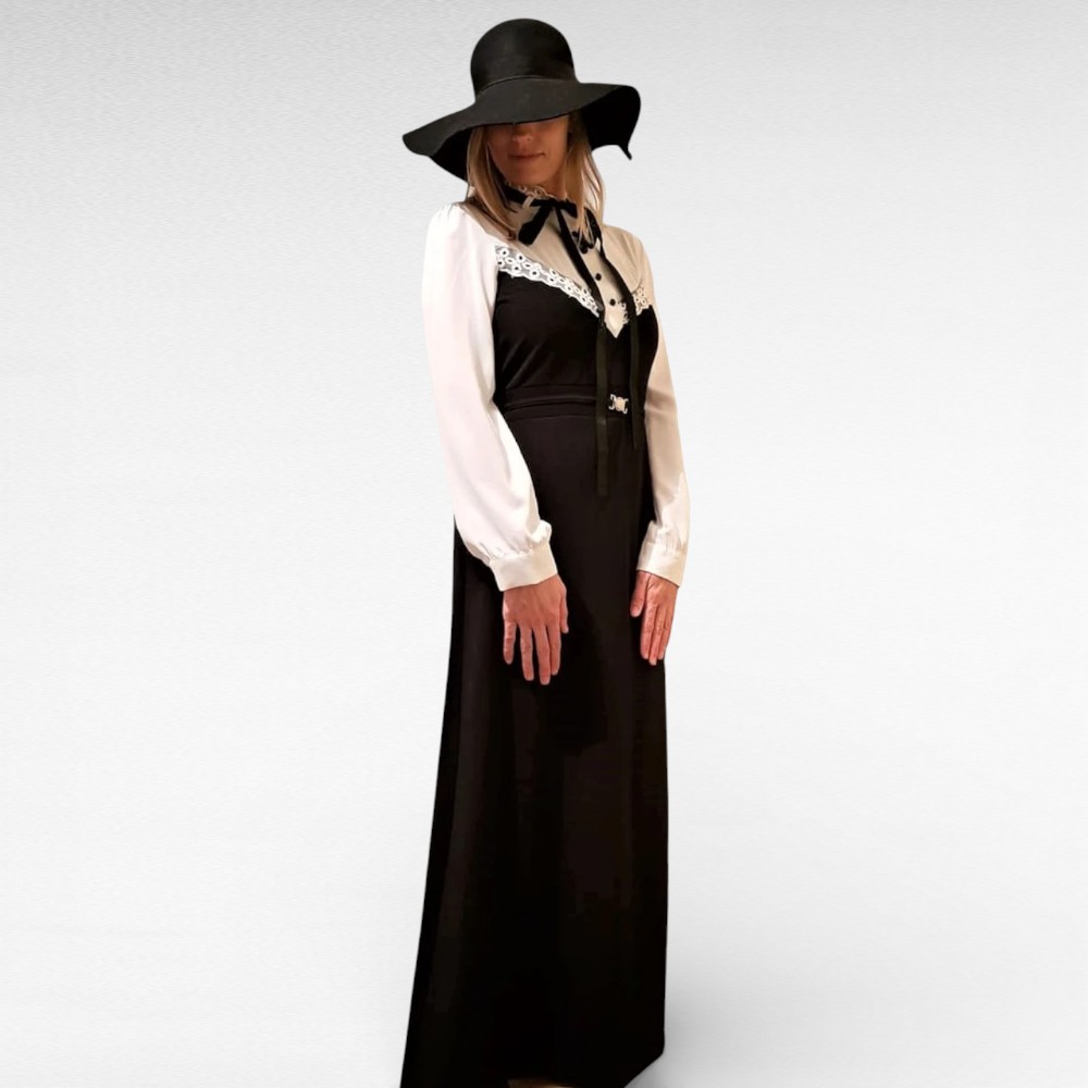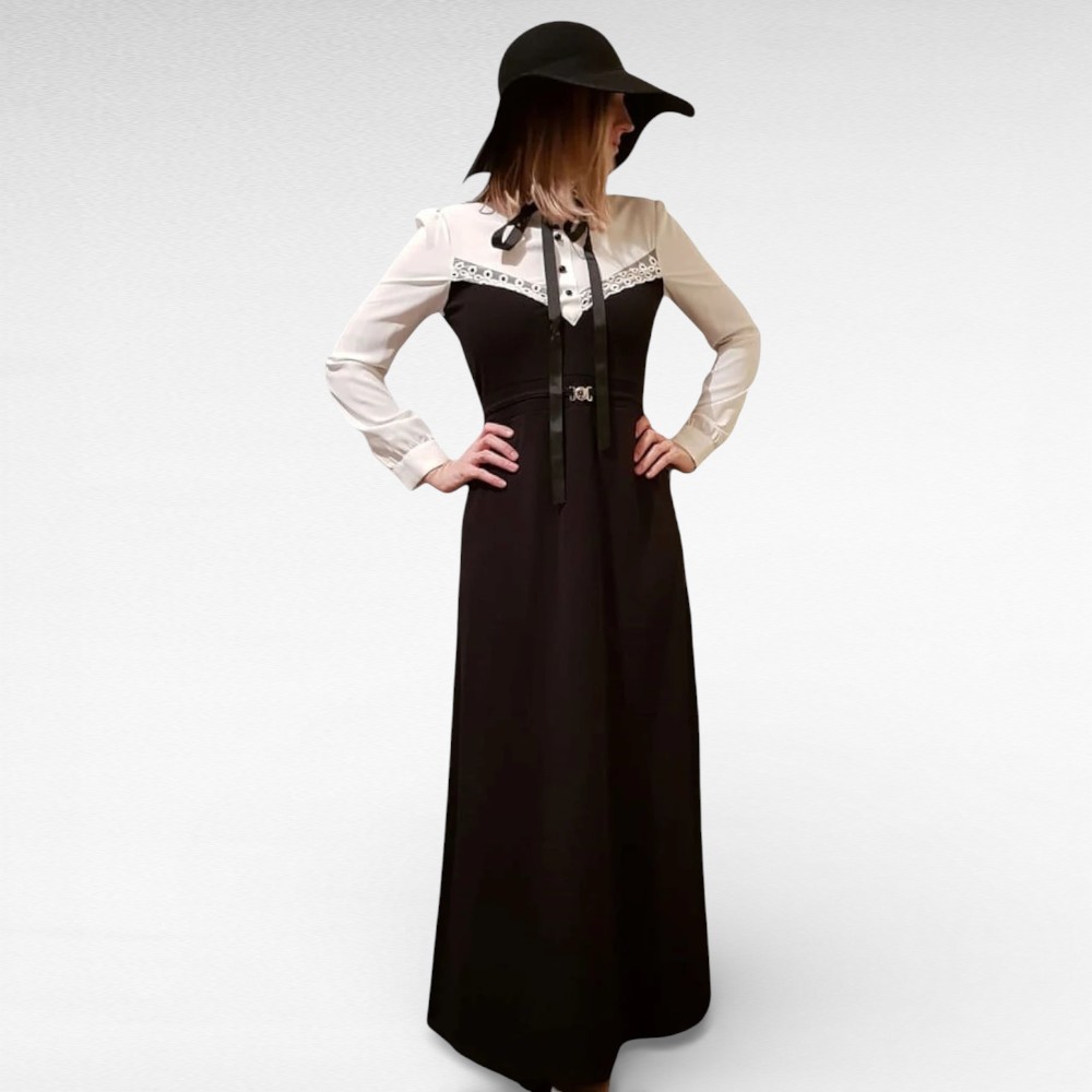 Stiilne musta ja valge tooniga keskelt vööga maksikleit “Lilia” Inglismaalt. Rinna peal väike nööbirida ja pitsiosa, krae juures must siidjas lipsuke. Keskelt veidi taljes lõige.
