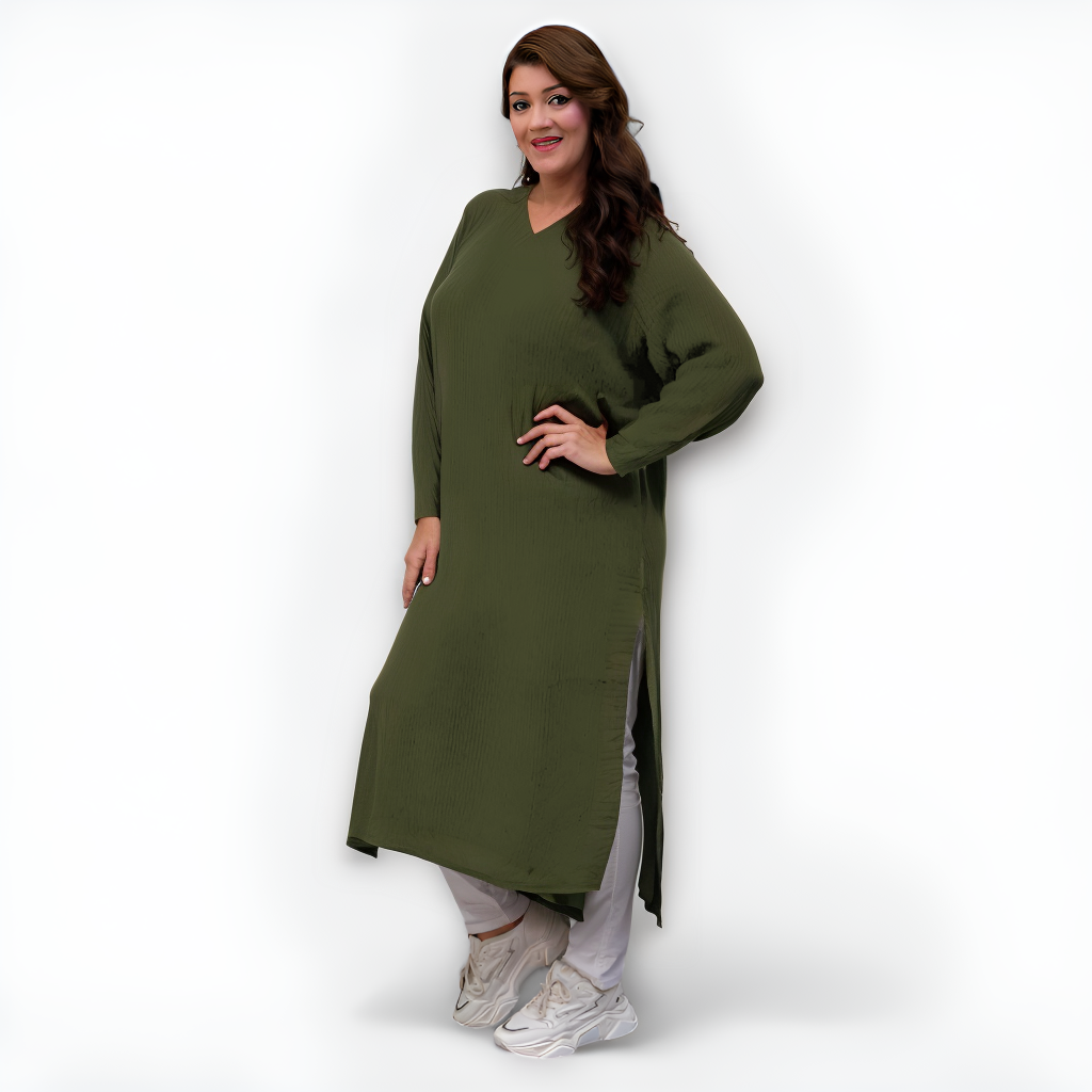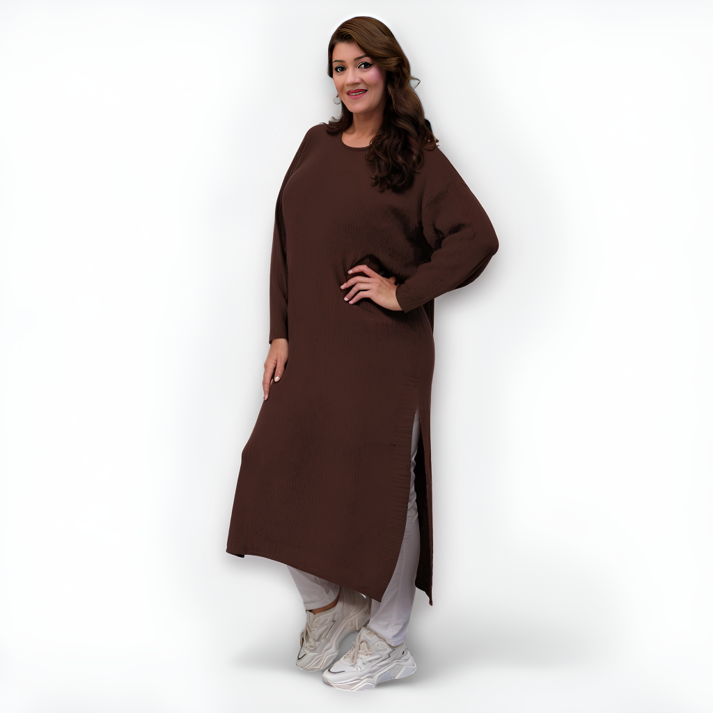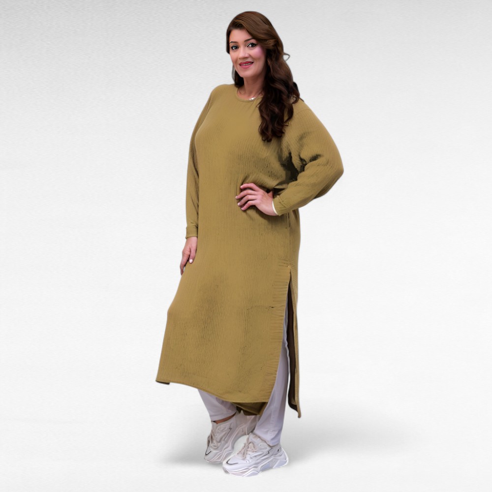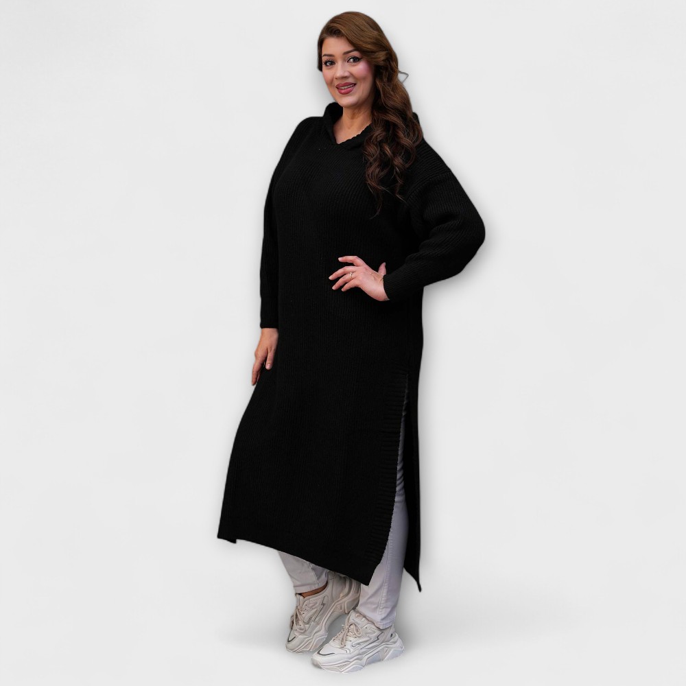 Väga stiilne pikk kootud materjalist külje pealt pikkade lõhikutega triibulise koemustriga pluss suuruses kapuutsiga hõlst/kleit. Naiselikud avarad õlast pikendatud otsast soonikuga balloonvarrukad. Sobib kanda teksade või retuuside peal.