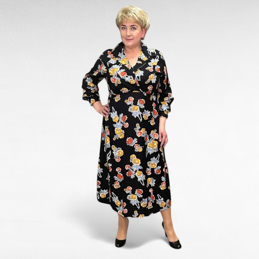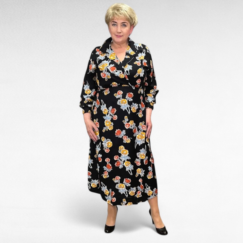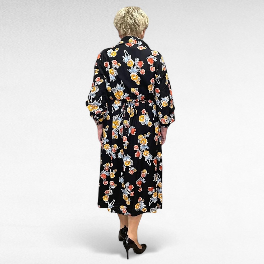 Naiselik must oranžikaspunase lillemustriga V-kaelusega keskelt läbilõikega ja rinnaosast ülevalt nööpidega viskoosmaterjalist pikkade varrukatega vööga kleit Inglismaalt firmalt “Jd Williams”. Selja taga vöökohas kumm.