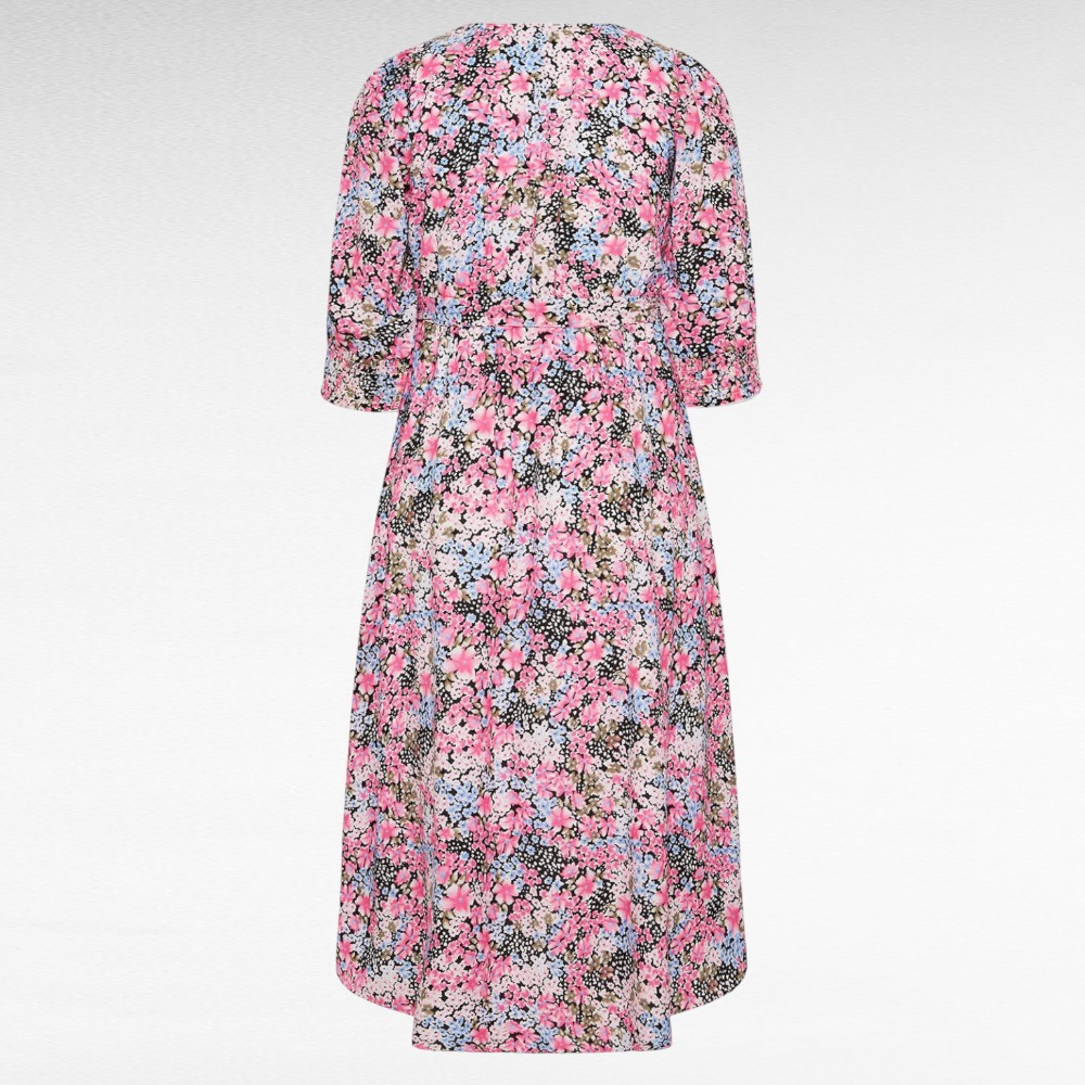 Roosakirju lillemustriga rinnaosast hõlmiklõikega, kroogitud poolpikkade avarate varrukatega naiselik vööga kleit Inglismaalt firmalt “Yours London”. Kleit on alt voodriga, vöökohas on läbilõige. Tagant on umbes 20cm pikem kui eest, altäär on kaarjas.