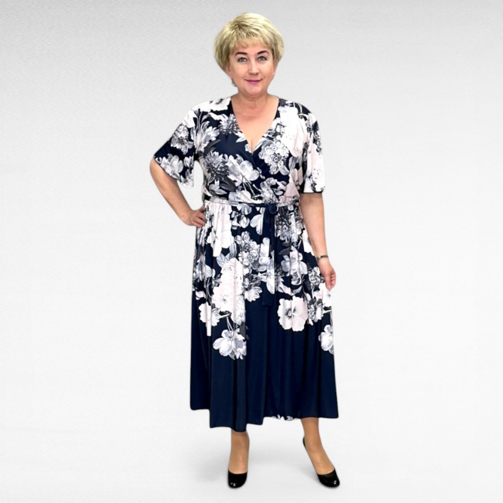 Kaunis roosa- ja lillakirju lillemustriga hõlmiklõikega kleit Inglismaalt firmalt “Quiz”. Keskel naiselik taljetrõhutav läbilõige. Huvitav tegumood- eest on seelikuosa hõlmiklõikega, külg on kinni õmmeldud ja lahti ei kisu. Esiosa on lühem ja tagant on umbes 15cm pikem saba. Väga hea keskmise paksusega mittekortsuv materjal.