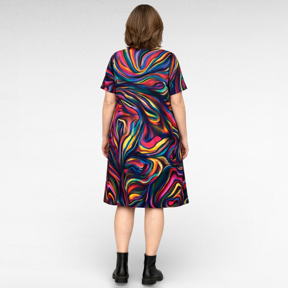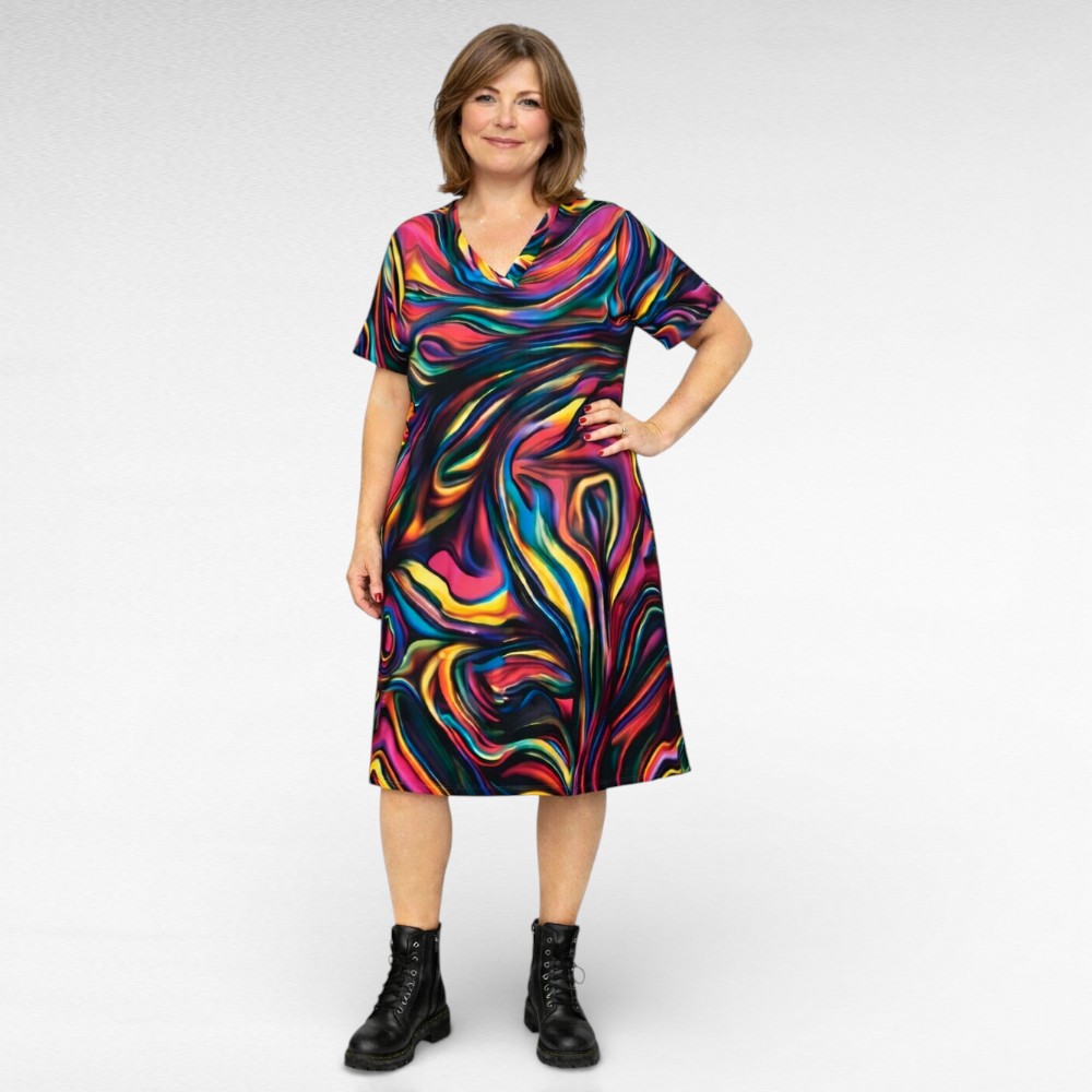 Värvikirev roosades, kollastes ja rohelistes toonides pehmest veidi venivast materjalist lühikeste varrukatega V-kaelusega taskutega kleit “Siki”.