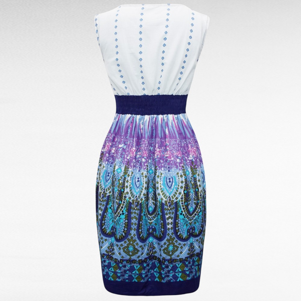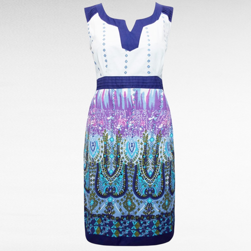 Valge põhja peal lillat tooni kanditud kaeluseosaga pilkupüüdva ornamentmustriga naiseliku keskelt veidi taljes lõikega õhemast viskoosmaterjalist suvekleidid Inglismaalt firmalt “Pistachio”. Pikkus jääb umbes põlveni.