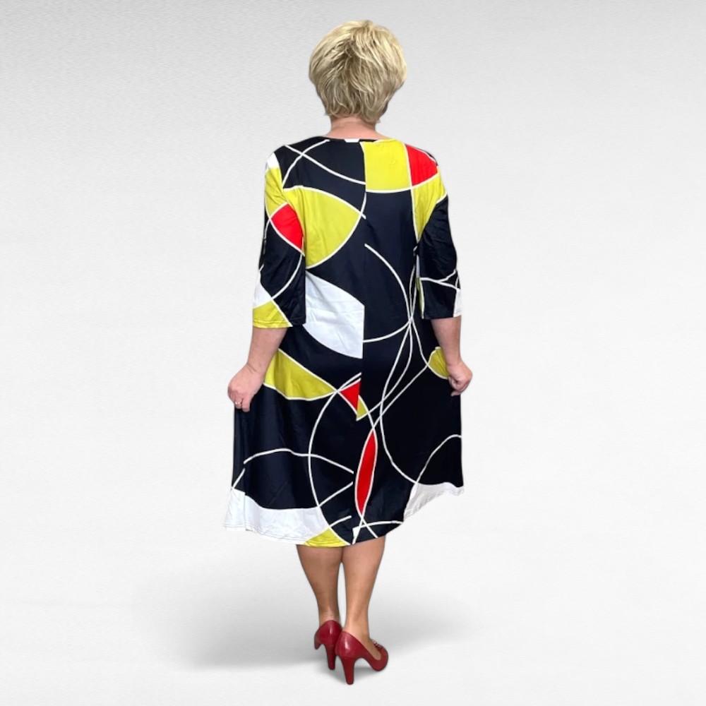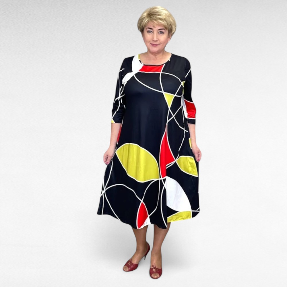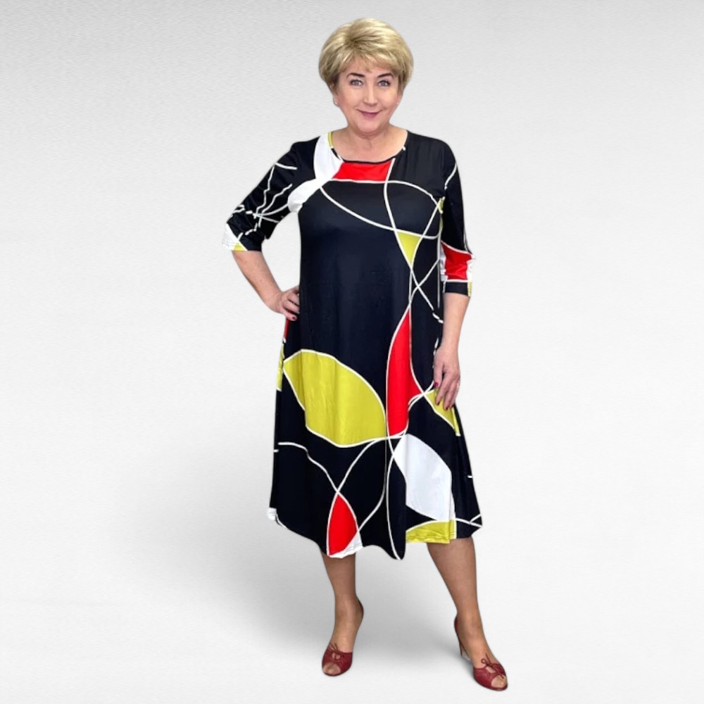 Pilkupüüdvates värvitoonides ( punane, sinepikollane ja must toon ) geomeetrilise mustriga poolpikkade varrukatega altlaienev kleit “Nelly”.