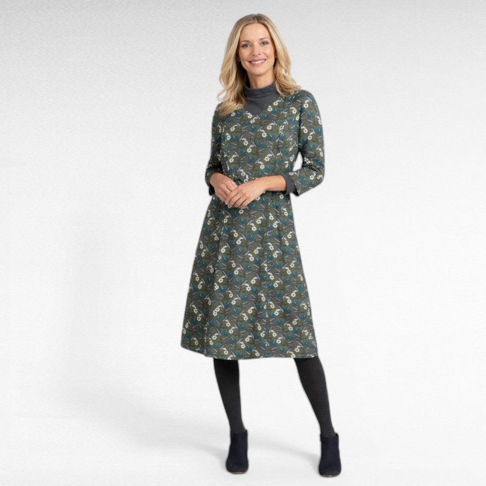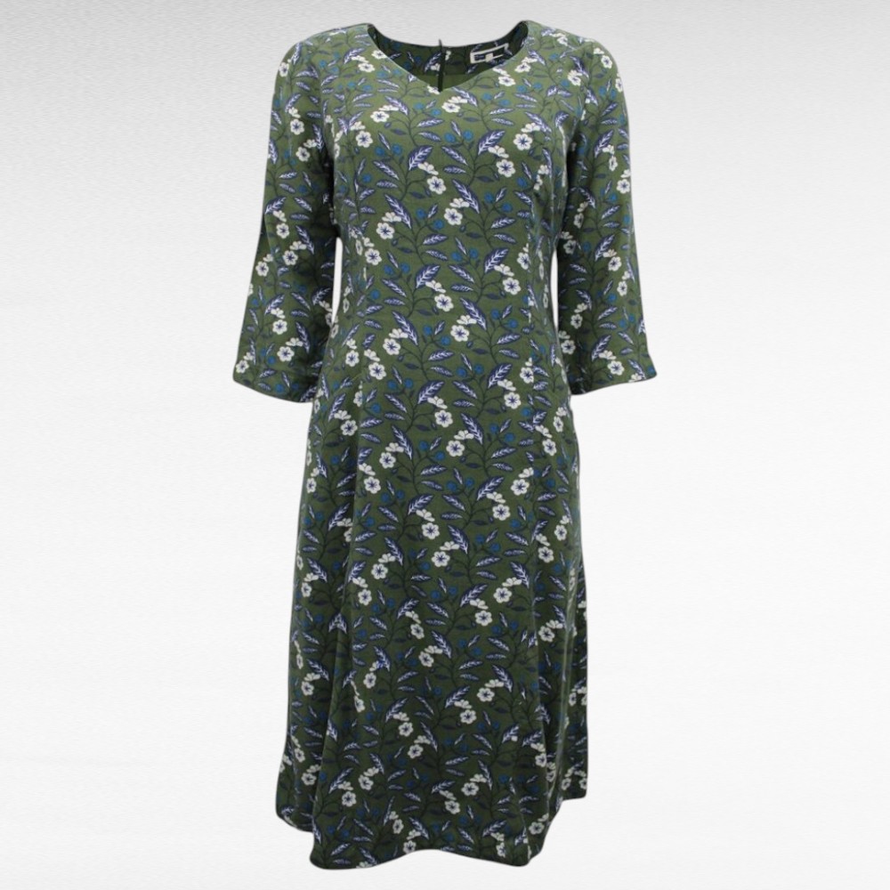 Väga heast kvaliteetsest puuvillasest materjalist alt voodriga V-kaelusega oliiviroheline beeži- ja siniselillelise mustriga kleit Inglismaalt firmalt “Seasalt”. Kleit on poolpikkade varrukatega, alt laieneva lõikega ja eest taskutega. Vöökoht on teljes, selja taga pikk lukk.