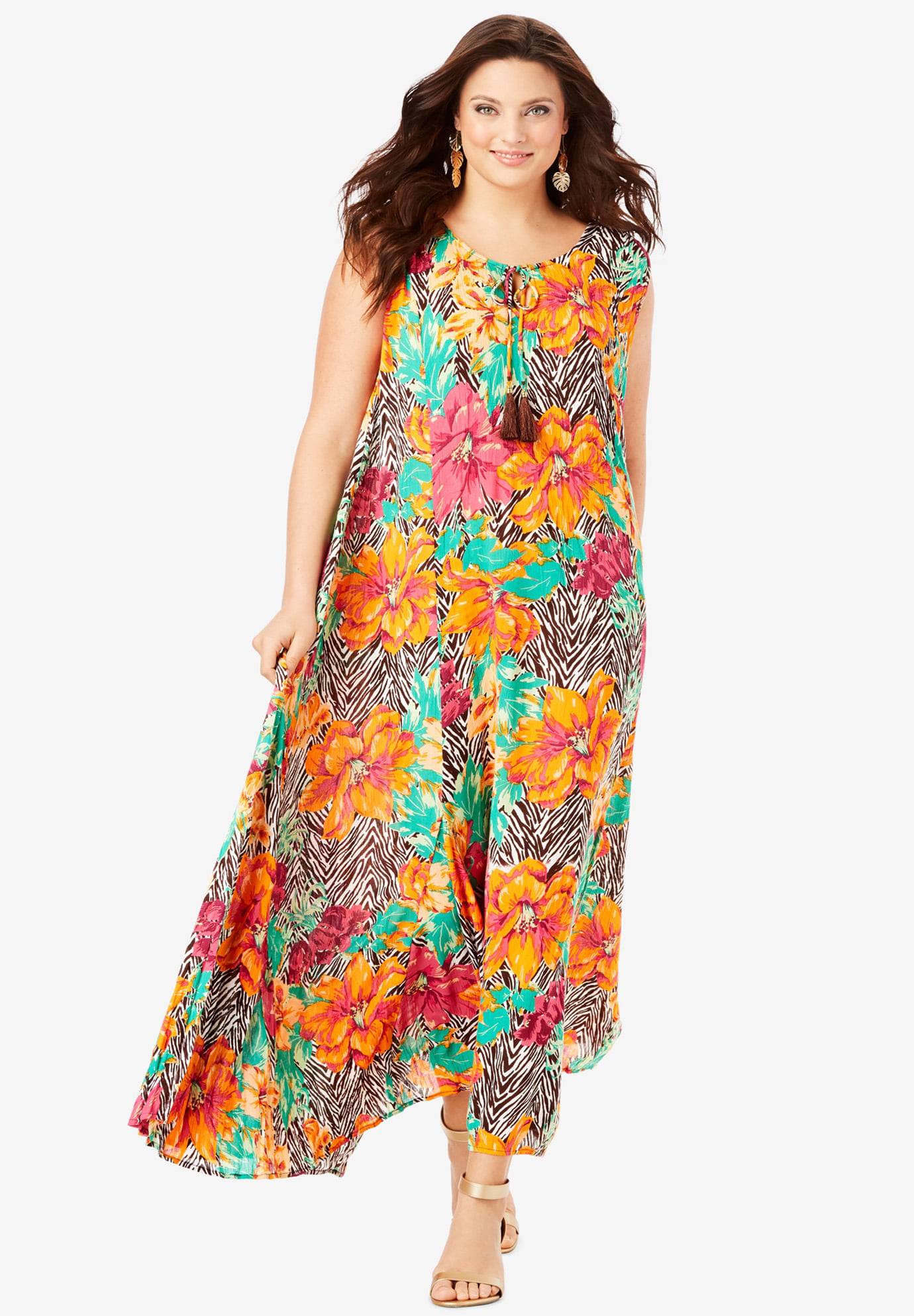 Imeilusates erksates oranžides, roosades ja rohelistes toonides kortsuriidest maksikleit Inglismaalt firmalt “Roamans”.