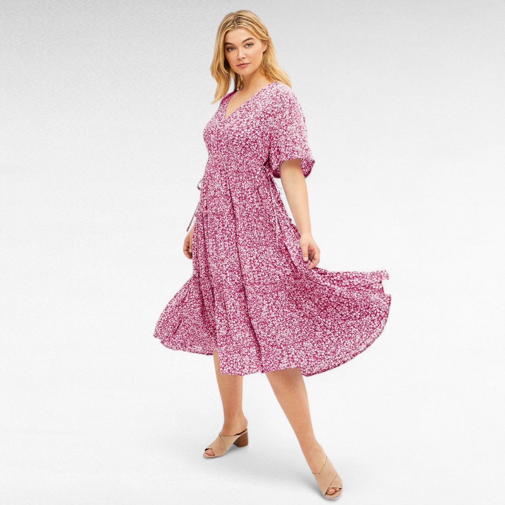 Naiselik roosa-ja valgekirju väikese mustriga rinnaosast hõlmiklõikega lühikeste avarate varrukatega suvekleit firmalt “Ellos”. Rinna all on läbilõige, allt 2 laia satsi. Rinnalusel läbilõikel on külgedel tunnelvööga paelad, mida saab kokku krousida täpselt nii palju, et enda keha järgi paras jääks.  Tegumood läheb alt kõvasti laiemaks. Väga kaunis kleit ning hea nahasõbralik materjal.