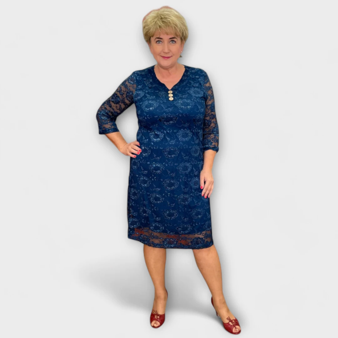 Väga kena naiselik sirge lõikega alt voodriga poolpikkade varrukatega pitskleit firmalt “Miss Classic”. Materjal on veniv. Kaeluse ääres kaunistuseks nööbid.