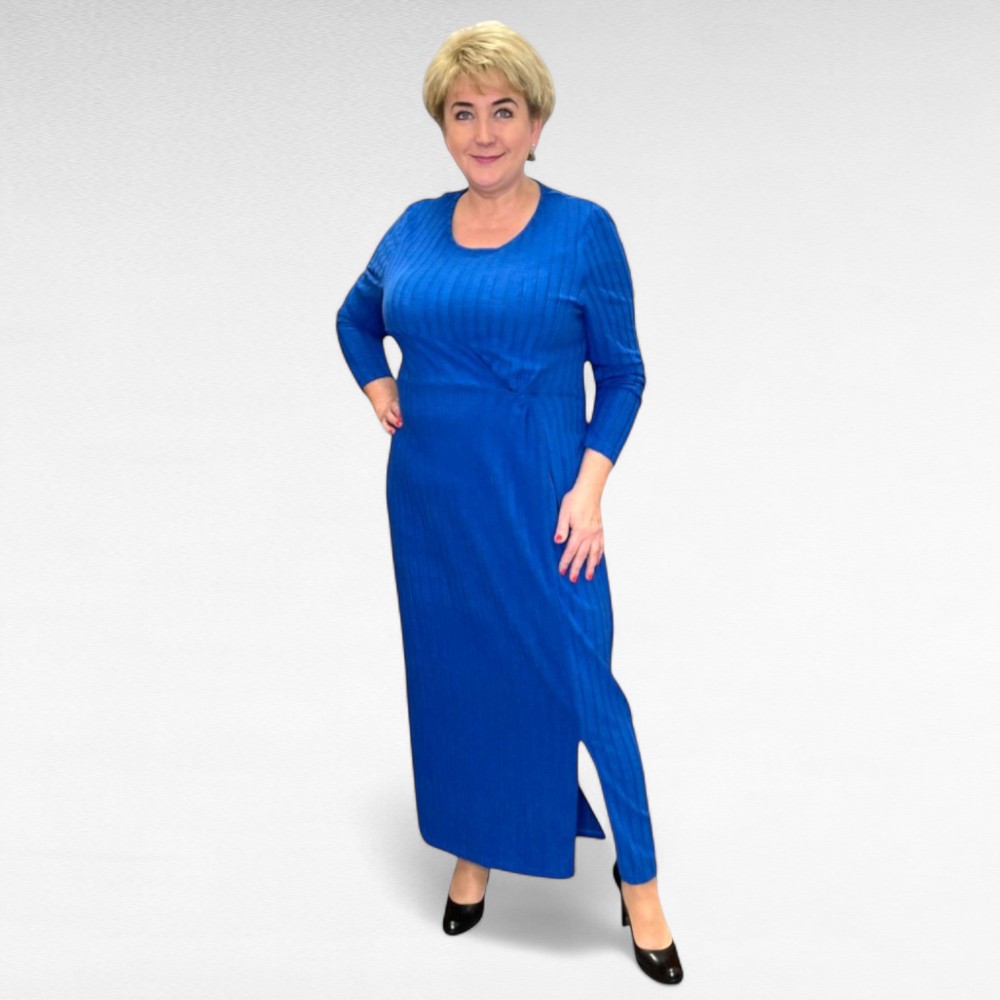 Mõnusast pehmest triibulise koemustriga materjalist vöökohast külje pealt krookega pikem alt lõhikuga erksinine kleit “Agatha”.