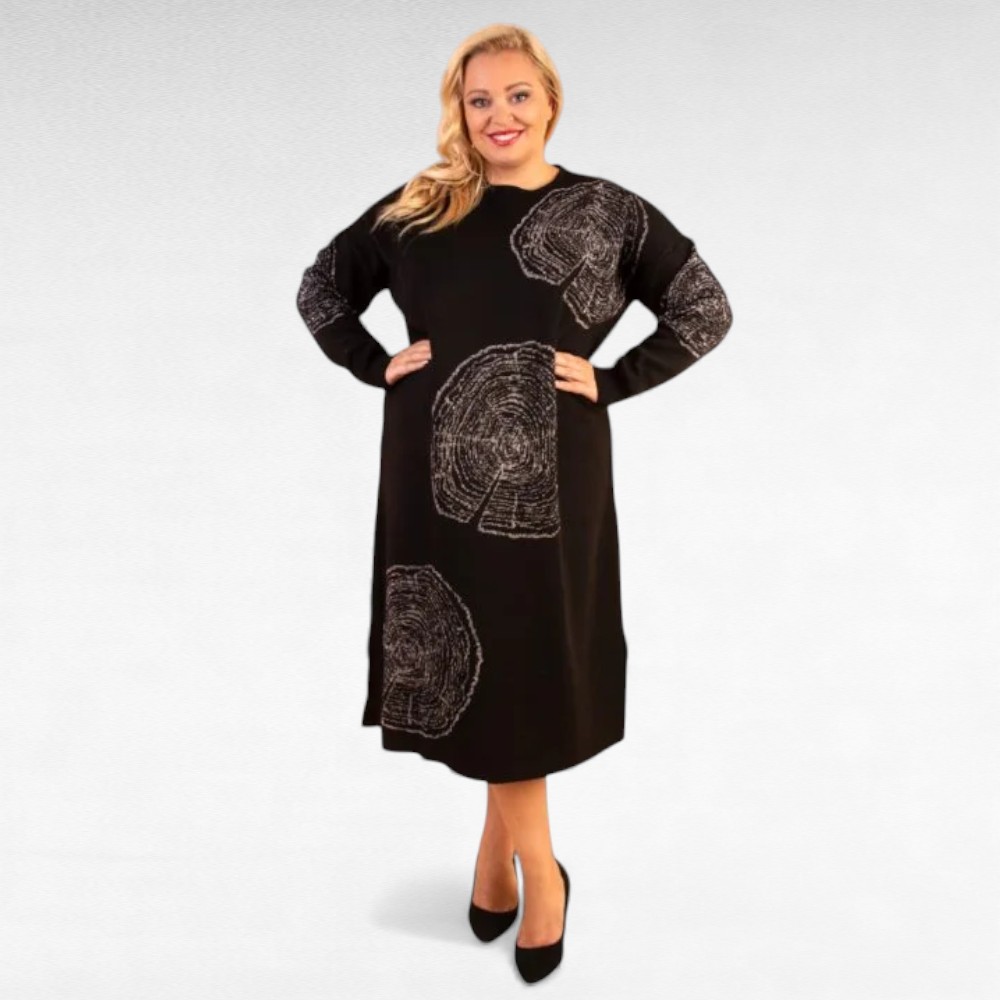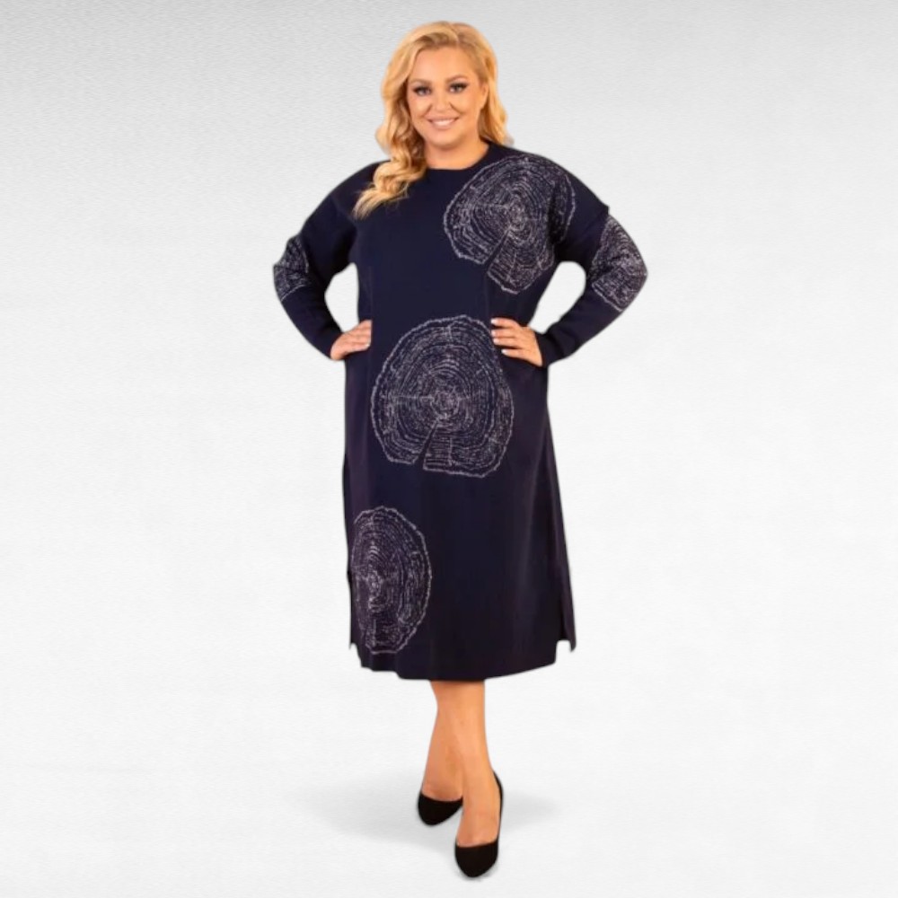 Soe pikem suure efektse hõbedase ringimustriga pluss suuruses kootud kleit/kampsunkleit “Miss Bonni”. Pikkus jääb poole sääreni, külgedel väikesed lõhikud.